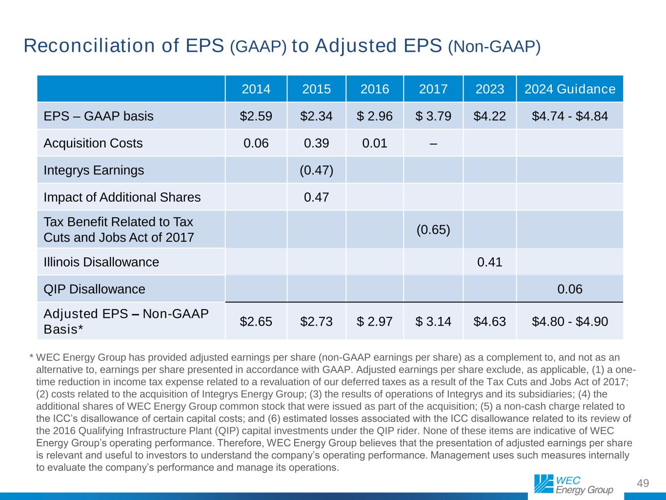 49 EPS(GAAP)与调整后EPS(Non-GAAP)的对账201420152016201720232024指导EPS – GAAP基础$ 2.59 $ 2.34 $ 2.96 $ 3.79 $ 4.22 $ 4.74-$ 4.84收购成本0.06 0.39 0.01 – Integrys收益(0.47)额外股份的影响0.47与2017年减税和就业法案相关的税收优惠(0.65)伊利诺伊州不允许0.41 QIP不允许0.06调整后EPS –非GAAP基础*$2.65 $2.73 $ 2.97 $ 3.14 $4.63 $4.80 - $4.90*WEC能源集团提供了调整后的每股收益(非公认会计准则每股收益)作为对,而不是作为替代方案,按照公认会计原则提出的每股收益。调整后每股收益(如适用)不包括(1)一次性减少与我们因2017年《减税和就业法案》而对递延税款进行重估相关的所得税费用;(2)与收购英迪斯能源集团相关的成本;(3)Integrys及其子公司的经营业绩;(4)增加的WEC能源集团普通股股份作为收购的一部分发行的;(5)与ICC不允许某些资本成本相关的非现金费用;(6)与ICC不允许相关的估计损失,与其审查QIP附加条款下的2016年合格基础设施工厂(QIP)资本投资有关。这些项目均不能对WEC能源集团的经营业绩产生指示作用。因此,WEC能源集团认为,调整后每股收益的列报对于投资者了解公司的经营业绩具有相关性和实用性。管理层在内部使用这些措施来评估公司的业绩并管理其运营。