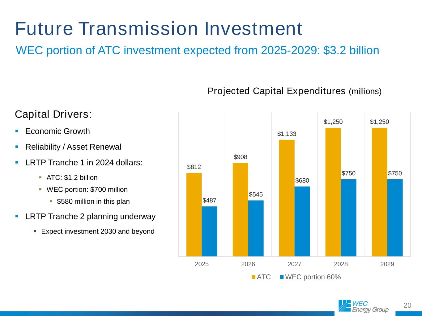 20美元812美元908美元1133美元1250美元1250美元487美元545美元680美元750美元75020252026202720282029 ATC WEC部分60%资本驱动因素:经济增长可靠性/资产更新2024年LRTP第1期美元:ATC:12亿美元WEC部分:本计划中的7亿美元5.8亿美元LRTP第2期规划正在进行中预计投资2030年及以后预计2025-2029年ATC投资的WEC部分:32亿美元未来输电投资预计资本支出(百万)
