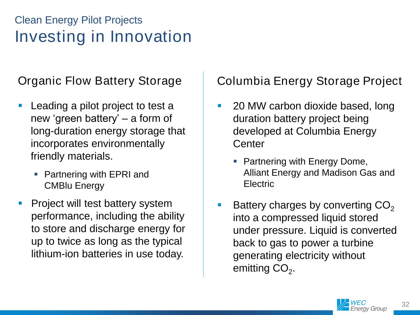 32有机液流电池存储领导一个试点项目,以测试一种新型‘绿色电池’——一种采用环保材料的长持续时间储能形式。与EPRI和CMBlu Energy项目合作将测试电池系统的性能,包括存储和放电能量的时间长达目前使用的典型锂离子电池的两倍。投资于创新清洁能源试点项目哥伦比亚储能项目20兆瓦二氧化碳为基础的长持续时间电池项目正在哥伦比亚能源中心与Energy Dome、美国联合能源和麦迪逊燃气合作开发,并通过将CO2转化为在压力下储存的压缩液体来为电池充电。液体被转换回气体,为涡轮机提供动力,在不排放二氧化碳的情况下发电。