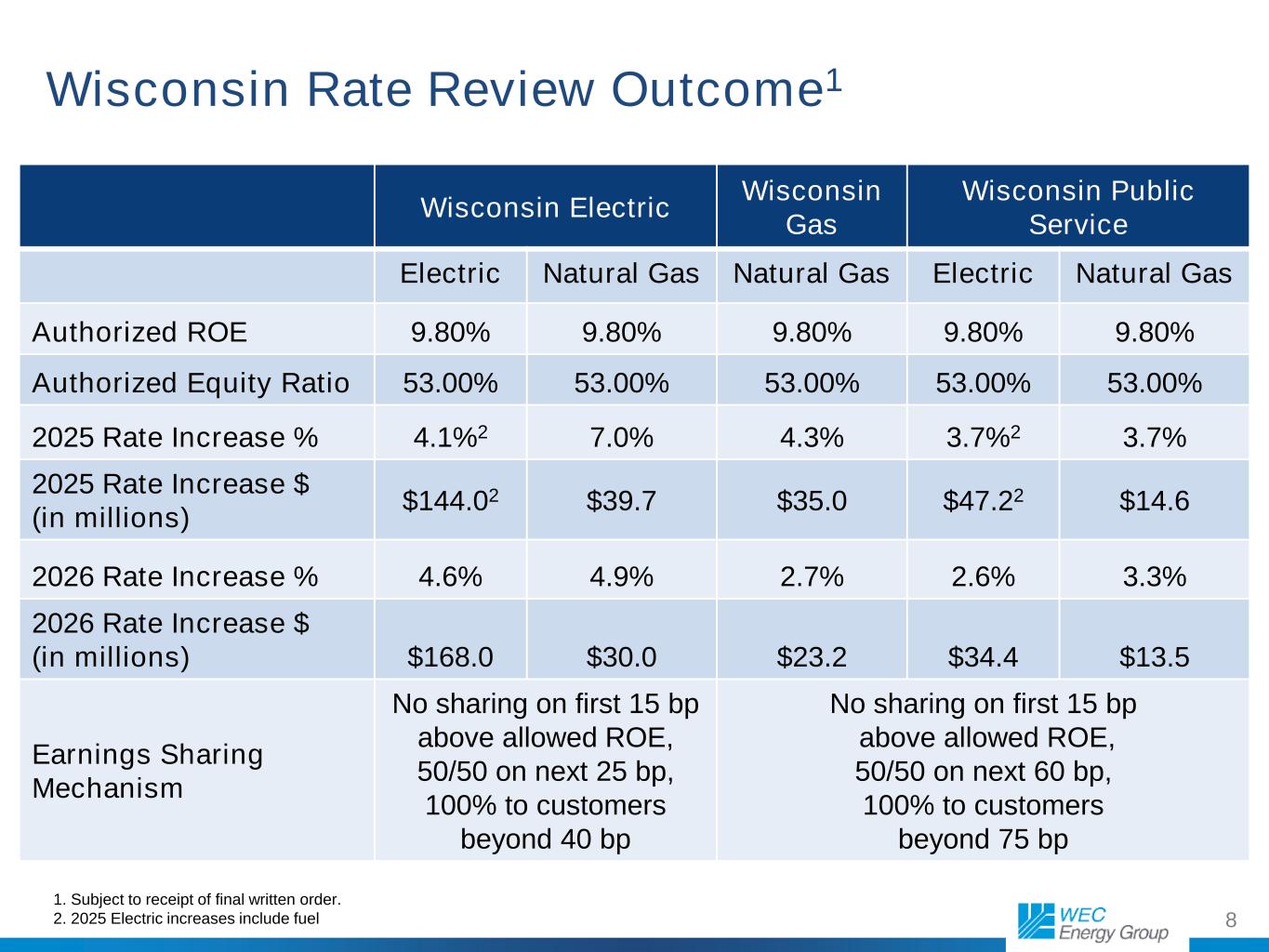 8 Wisconsin Electric Wisconsin Gas Wisconsin Public Service Electric Natural Natural Gas Natural Gas Electric Natural Gas Authorized ROE9.80 % 9.80% 9.80% 9.80% 9.80% 9.80% 9.80% Authorized equity ratio 53.00% 53.00% 53.00% 53.00% 53.00% 2025Rate increase % 4.1% 27.0% 4.3% 3.7% 23.7% 2025Rate increase $(in millions)$ 144.02 $ 39.7 $ 35.0 $ 47.22 $ 14.62026 Rate increase % 4.6% 4.9% 2.7% 2.6% 3.3% 2026 Rate increase $(in millions)$ 168.0 $ 30.0 $ 23.2 $ 34.4 $ 13.5 earnings sharing mechanism no sharing on the fir100%给客户超过40个bp以上不共享第一个15个bp以上允许ROE,50/50下一个60个bp,100%给客户超过75个bp威斯康星利率审查结果11。以收到最终书面命令为准。2.2025年电力增量包括燃料