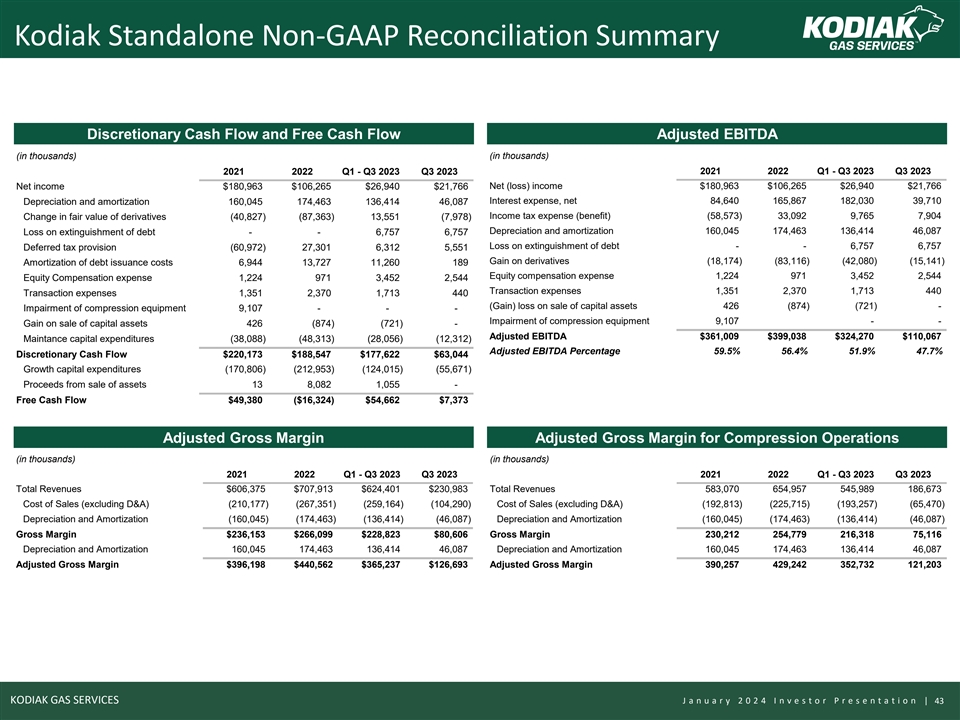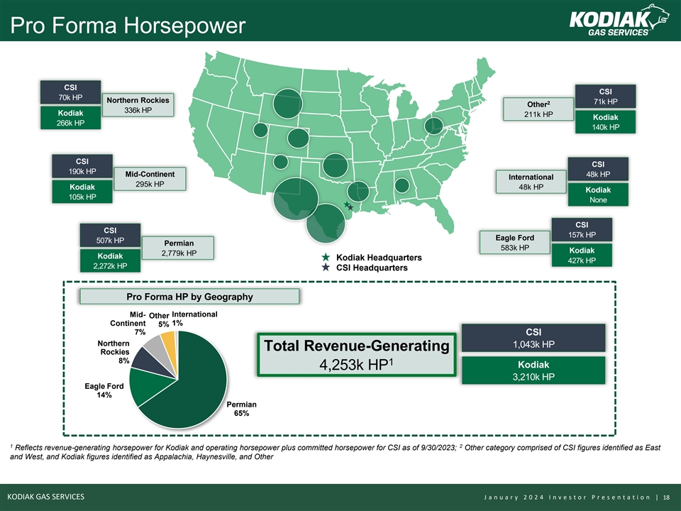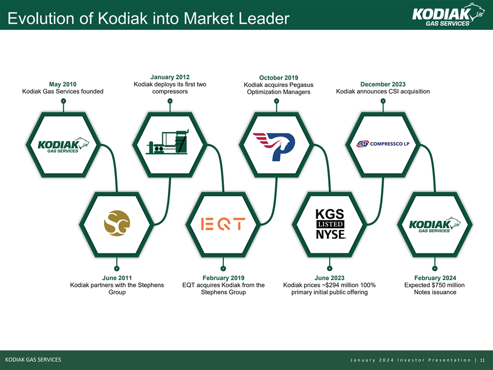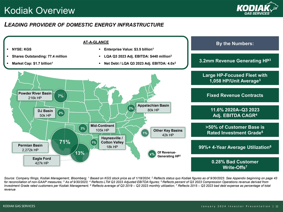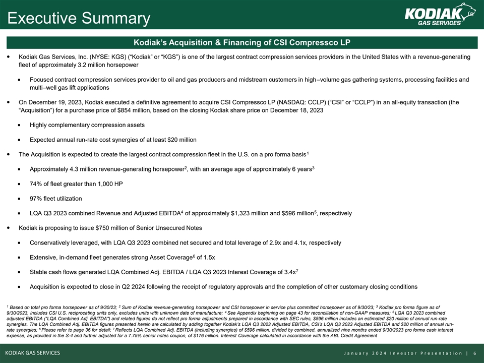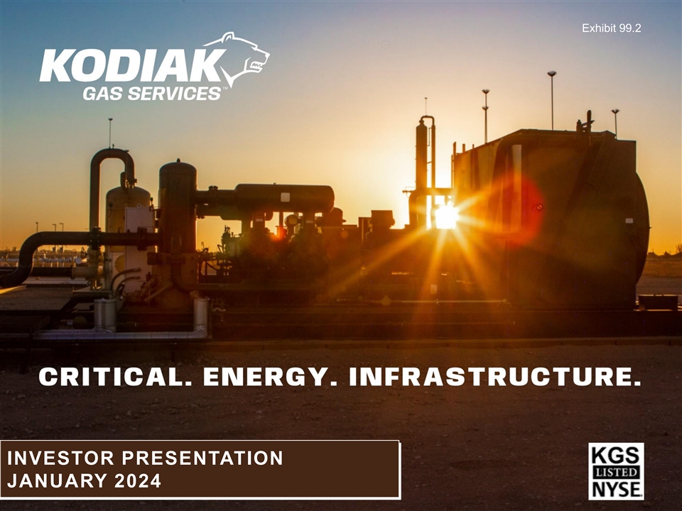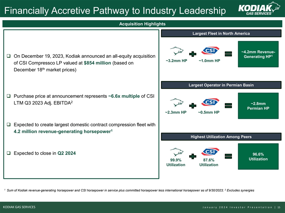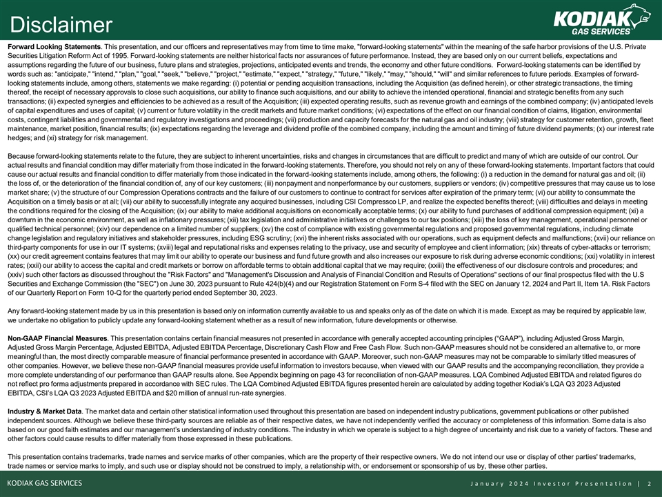 免责声明前瞻性陈述。本演示文稿,以及我们的官员和代表可能会不时做出,1995年美国私人证券诉讼改革法案安全港条款含义内的前瞻性陈述。前瞻性陈述既不是历史事实,也不是对未来业绩的保证。相反,它们仅基于我们当前对业务未来的信念、期望和假设、未来计划和战略、预测、预期事件和趋势、经济和其他未来条件。前瞻性陈述可以通过以下词语来识别:预期、打算、计划、目标、寻求、相信、项目、估计、期望、战略、未来、可能、可能、应该、将和对未来时期的类似提及。前瞻性陈述的例子包括,除其他外,我们就以下方面作出的陈述:(i)潜在或待完成的收购交易,包括收购(如本文所定义),或其他战略交易,时间安排,获得完成此类收购的必要批准,我们为此类收购提供资金的能力,以及我们从任何此类交易中实现预期的运营、财务和战略利益的能力;(ii)预期因收购而实现的协同效应和效率;(iii)预期经营业绩,例如合并后公司的收入增长和收益;(iv)资本支出和资本使用的预期水平;(v)信贷市场当前或未来的波动和未来市场状况;(vi)对索赔、诉讼、环境成本、或有负债以及政府和监管调查和诉讼对我们财务状况的影响的预期;(vii)天然气和石油行业的产量和产能预测;(viii)客户保留、增长、车队维护、市场地位、财务业绩的战略;(ix)对合并后公司的杠杆和股息状况的预期,包括未来股息支付的金额和时间;(x)我们的利率对冲;和(xi)风险管理策略。由于前瞻性陈述与未来相关,它们受到固有的不确定性、风险和难以预测的环境变化的影响,其中许多是我们无法控制的。我们的实际结果和财务状况可能与前瞻性陈述中指出的存在重大差异。因此,你不应该依赖这些前瞻性陈述中的任何一个。可能导致我们的实际业绩和财务状况与前瞻性陈述中指出的存在重大差异的重要因素包括(其中包括)以下因素:(i)对天然气和石油的需求减少;(ii)我们的任何主要客户的损失或财务状况恶化;(iii)我们的客户不付款和不履约,供应商或供应商;(iv)可能导致我们失去市场份额的竞争压力;(v)我们的压缩业务合同的结构以及我们的客户在主要期限届满后未能继续签订服务合同;(vi)我们及时或完全完成收购的能力;(vii)我们成功整合任何收购业务的能力,包括CSI Compressco LP,并实现其预期收益;(viii)在满足完成收购所需的条件方面遇到困难和延误;(ix)我们以经济上可接受的条款进行额外收购的能力;(x)我们为购买额外压缩设备提供资金的能力;(xi)经济环境低迷,以及通胀压力;(xii)税收立法和行政举措或对我们税务状况的挑战;(xiii)关键管理层的流失,运营人员或合格技术人员;(xiv)我们对数量有限的供应商的依赖;(xv)遵守现有政府法规和拟议政府法规的成本,包括气候变化立法和监管举措以及利益相关者的压力,包括ESG审查;(xvi)与我们的运营相关的固有风险,例如设备缺陷和故障;(xvii)我们依赖第三方组件用于我们的IT系统;(xviii)与隐私相关的法律和声誉风险及费用, 员工和客户信息的使用和安全;(xix)网络攻击或恐怖主义威胁;(xx)我们的信贷协议包含的功能可能会限制我们经营业务和为未来增长提供资金的能力,也会增加我们在不利经济条件下的风险敞口;(xxi)利率波动;(xxii)我们进入资本和信贷市场或以负担得起的条件借款以获得额外资本的能力我们可能要求的;(xxiii)我们的披露控制和程序的有效性;(xxiv)我们于2023年6月30日根据规则424(b)(4)和我们于2024年1月12日向SEC提交的表格S-4上的注册声明以及第II部分第1A项,向美国证券交易委员会(SEC)提交的最终招股说明书的风险因素和管理层对财务状况和运营结果部分的讨论和分析中所讨论的其他因素。我们截至2023年9月30日的季度报表10-Q季度报告的风险因素。我们在本演示文稿中所作的任何前瞻性陈述仅基于我们目前可获得的信息,并且仅在其发表之日发表。除适用法律可能要求外,我们不承担因新信息、未来发展或其他原因而公开更新任何前瞻性陈述的义务。非GAAP财务指标。本演示文稿包含某些未按照公认会计原则(“GAAP”)列报的财务指标,包括调整后的毛利率、调整后的毛利率百分比、调整后的EBITDA、调整后的EBITDA百分比、可自由支配的现金流和自由现金流。此类非公认会计原则衡量标准不应被视为根据公认会计原则提出的最直接可比的财务业绩衡量标准的替代方法,或更有意义。此外,这类非GAAP衡量标准可能无法与其他公司类似名称的衡量标准相提并论。然而,我们认为这些非GAAP财务指标为投资者提供了有用的信息,因为当与我们的GAAP结果和随附的对账一起查看时,它们提供了对我们业绩的更完整的理解,而不是单独的GAAP结果。有关非GAAP措施的调节,请参见第43页开始的附录。LQA合并调整后EBITDA和相关数字不反映根据SEC规则编制的备考调整。本文提供的LQA合并调整后EBITDA数据是通过将Kodiak的LQA2023 Q3调整后EBITDA、CSI的LQA2023 Q3调整后EBITDA和2000万美元的年度运行率协同效应相加计算得出的。行业&市场数据。本演示文稿中使用的市场数据和某些其他统计信息基于独立的行业出版物、政府出版物或其他已发布的独立来源。尽管我们认为这些第三方来源在其各自日期是可靠的,但我们没有独立核实这些信息的准确性或完整性。一些数据也是基于我们的善意估计和我们的管理层对行业状况的理解。我们所处的行业由于多种