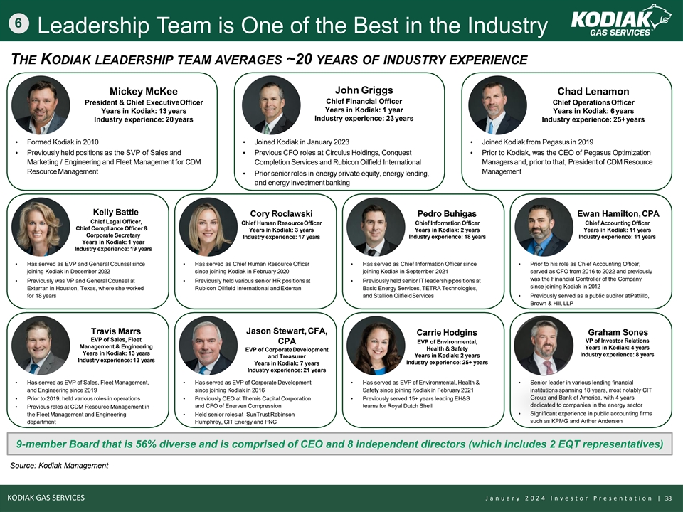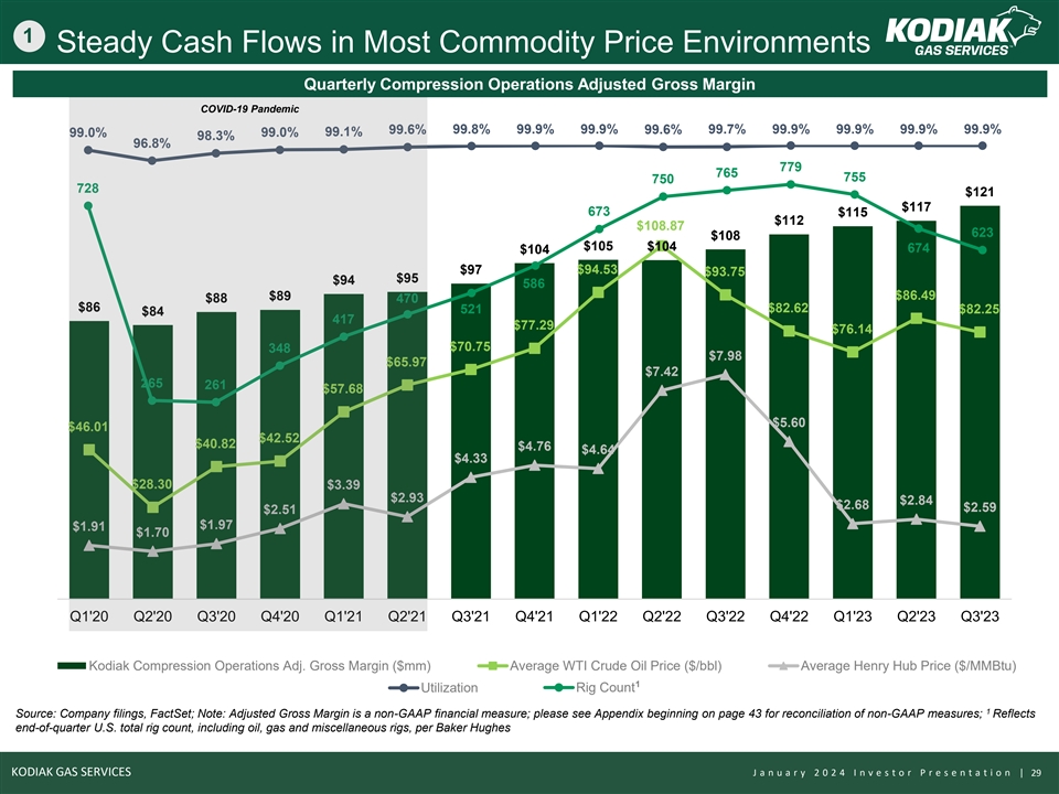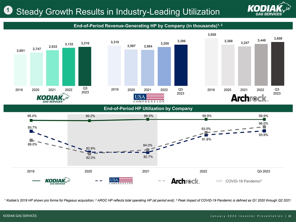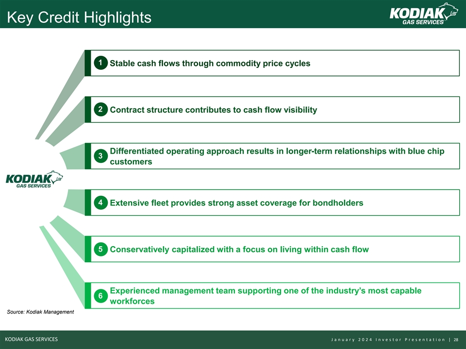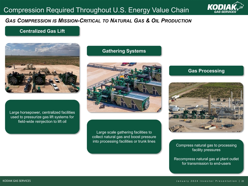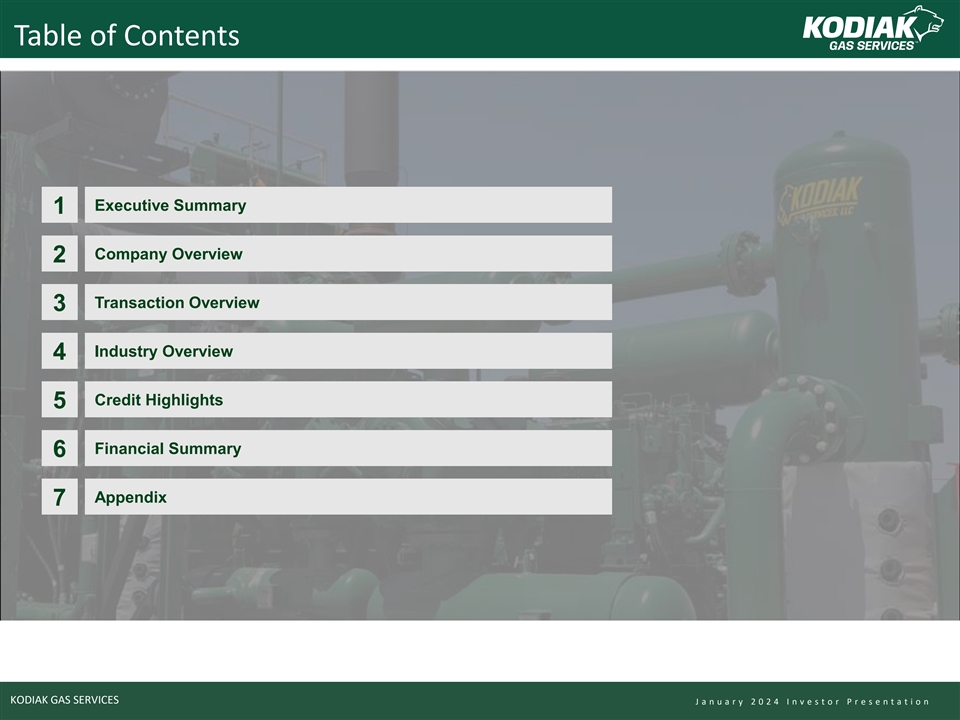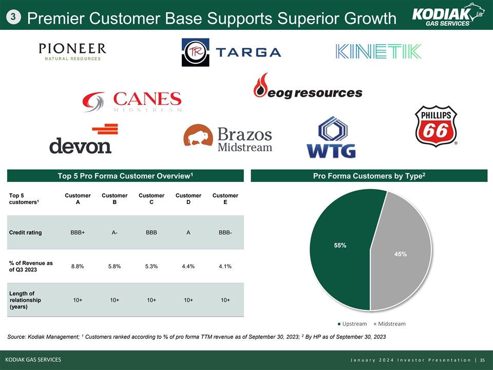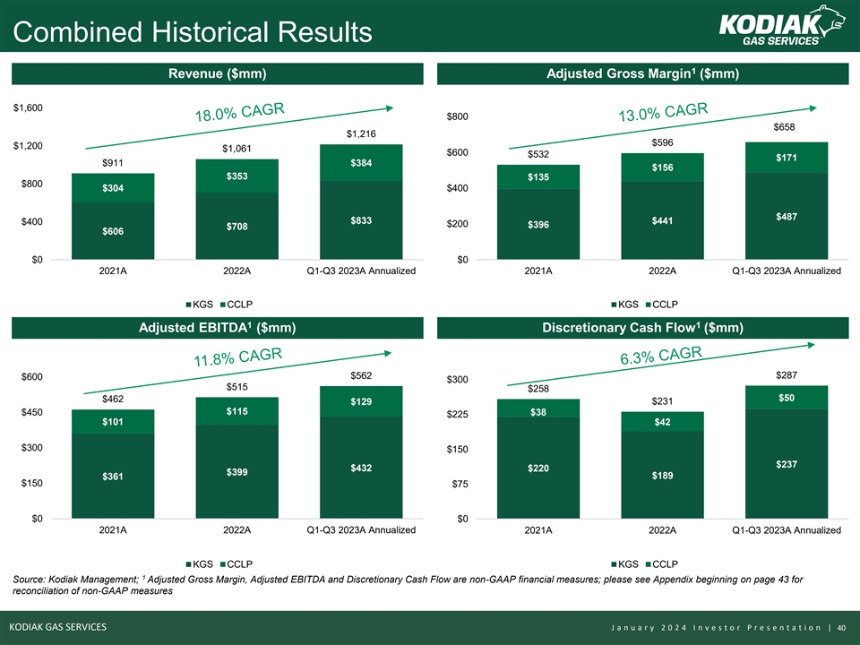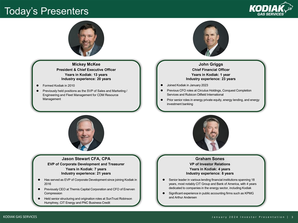 免责声明前瞻性陈述。本演示文稿,以及我们的官员和代表可能会不时做出,1995年美国私人证券诉讼改革法案安全港条款含义内的前瞻性陈述。前瞻性陈述既不是历史事实,也不是对未来业绩的保证。相反,它们仅基于我们当前对业务未来的信念、期望和假设、未来计划和战略、预测、预期事件和趋势、经济和其他未来条件。前瞻性陈述可以通过以下词语来识别:预期、打算、计划、目标、寻求、相信、项目、估计、期望、战略、未来、可能、可能、应该、将和对未来时期的类似提及。前瞻性陈述的例子包括,除其他外,我们就以下方面作出的陈述:(i)潜在或待完成的收购交易,包括收购(如本文所定义),或其他战略交易,时间安排,获得完成此类收购的必要批准,我们为此类收购提供资金的能力,以及我们从任何此类交易中实现预期的运营、财务和战略利益的能力;(ii)预期因收购而实现的协同效应和效率;(iii)预期经营业绩,例如合并后公司的收入增长和收益;(iv)资本支出和资本使用的预期水平;(v)信贷市场当前或未来的波动和未来市场状况;(vi)对索赔、诉讼、环境成本、或有负债以及政府和监管调查和诉讼对我们财务状况的影响的预期;(vii)天然气和石油行业的产量和产能预测;(viii)客户保留、增长、车队维护、市场地位、财务业绩的战略;(ix)对合并后公司的杠杆和股息状况的预期,包括未来股息支付的金额和时间;(x)我们的利率对冲;和(xi)风险管理策略。由于前瞻性陈述与未来相关,它们受到固有的不确定性、风险和难以预测的环境变化的影响,其中许多是我们无法控制的。我们的实际结果和财务状况可能与前瞻性陈述中指出的存在重大差异。因此,你不应该依赖这些前瞻性陈述中的任何一个。可能导致我们的实际业绩和财务状况与前瞻性陈述中指出的存在重大差异的重要因素包括(其中包括)以下因素:(i)对天然气和石油的需求减少;(ii)我们的任何主要客户的损失或财务状况恶化;(iii)我们的客户不付款和不履约,供应商或供应商;(iv)可能导致我们失去市场份额的竞争压力;(v)我们的压缩业务合同的结构以及我们的客户在主要期限届满后未能继续签订服务合同;(vi)我们及时或完全完成收购的能力;(vii)我们成功整合任何收购业务的能力,包括CSI Compressco LP,并实现其预期收益;(viii)在满足完成收购所需的条件方面遇到困难和延误;(ix)我们以经济上可接受的条款进行额外收购的能力;(x)我们为购买额外压缩设备提供资金的能力;(xi)经济环境低迷,以及通胀压力;(xii)税收立法和行政举措或对我们税务状况的挑战;(xiii)关键管理层的流失,运营人员或合格技术人员;(xiv)我们对数量有限的供应商的依赖;(xv)遵守现有政府法规和拟议政府法规的成本,包括气候变化立法和监管举措以及利益相关者的压力,包括ESG审查;(xvi)与我们的运营相关的固有风险,例如设备缺陷和故障;(xvii)我们依赖第三方组件用于我们的IT系统;(xviii)与隐私相关的法律和声誉风险及费用, 员工和客户信息的使用和安全;(xix)网络攻击或恐怖主义威胁;(xx)我们的信贷协议包含的功能可能会限制我们经营业务和为未来增长提供资金的能力,也会增加我们在不利经济条件下的风险敞口;(xxi)利率波动;(xxii)我们进入资本和信贷市场或以负担得起的条件借款以获得额外资本的能力我们可能要求的;(xxiii)我们的披露控制和程序的有效性;(xxiv)我们于2023年6月30日根据规则424(b)(4)和我们于2024年1月12日向SEC提交的表格S-4上的注册声明以及第II部分第1A项,向美国证券交易委员会(SEC)提交的最终招股说明书的风险因素和管理层对财务状况和运营结果部分的讨论和分析中所讨论的其他因素。我们截至2023年9月30日的季度报表10-Q季度报告的风险因素。我们在本演示文稿中所作的任何前瞻性陈述仅基于我们目前可获得的信息,并且仅在其发表之日发表。除适用法律可能要求外,我们不承担因新信息、未来发展或其他原因而公开更新任何前瞻性陈述的义务。非GAAP财务指标。本演示文稿包含某些未按照公认会计原则(“GAAP”)列报的财务指标,包括调整后的毛利率、调整后的毛利率百分比、调整后的EBITDA、调整后的EBITDA百分比、可自由支配的现金流和自由现金流。此类非公认会计原则衡量标准不应被视为根据公认会计原则提出的最直接可比的财务业绩衡量标准的替代方法,或更有意义。此外,这类非GAAP衡量标准可能无法与其他公司类似名称的衡量标准相提并论。然而,我们认为这些非GAAP财务指标为投资者提供了有用的信息,因为当与我们的GAAP结果和随附的对账一起查看时,它们提供了对我们业绩的更完整的理解,而不是单独的GAAP结果。有关非GAAP措施的调节,请参见第43页开始的附录。LQA合并调整后EBITDA和相关数字不反映根据SEC规则编制的备考调整。本文提供的LQA合并调整后EBITDA数据是通过将Kodiak的LQA2023 Q3调整后EBITDA、CSI的LQA2023 Q3调整后EBITDA和2000万美元的年度运行率协同效应相加计算得出的。行业&市场数据。本演示文稿中使用的市场数据和某些其他统计信息基于独立的行业出版物、政府出版物或其他已发布的独立来源。尽管我们认为这些第三方来源在其各自日期是可靠的,但我们没有独立核实这些信息的准确性或完整性。一些数据也是基于我们的善意估计和我们的管理层对行业状况的理解。我们所处的行业由于多种