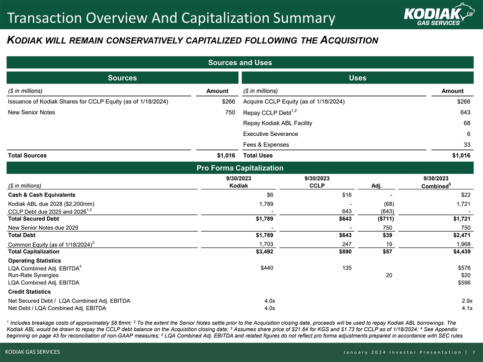 执行摘要Kodiak对CSI Compressco LP的收购和融资—— Kodiak Gas Services,Inc.(NYSE:KGS)(“Kodiak”或“KGS”)是美国最大的合同压缩服务提供商之一,拥有约320万马力的创收车队,专注于为油气生产商和中游客户提供大流量集气系统、处理设施和多井气举应用的合同压缩服务—— 2023年12月19日,Kodiak执行最终协议,将以全股权交易(“收购”)的方式收购CSI Compressco LP(NASDAQ:CCLP)(“CSI”或“CCLP”),收购价格为8.54亿美元,基于2023年12月18日收盘Kodiak股价↓高度互补的压缩资产↓预计每年的运行率成本协同效应至少为2000万美元1 —此次收购预计将在备考基础上创造美国最大的合同压缩车队23 ↓约430万的创收马力,平均机龄约为6年↓ 74%的机队大于1,000架惠普 ↓97%的机队利用率45 ↓ LQA2023年第三季度合并收入和调整后EBITDA分别约为13.23亿美元和5.96亿美元— Kodiak提议发行7.5亿美元的高级无抵押票据↓保守杠杆,LQA2023年第三季度合并净担保和总杠杆分别为2.9倍和4.1倍,分别为6 ↓广泛,需求旺盛的车队产生1.5x的强劲资产覆盖率7 ↓产生稳定现金流的LQA合并调整后。EBITDA/LQA2023年第三季度利息覆盖率为3.4倍↓收购预计将在收到监管批准并完成其他惯例成交条件后于2024年第二季度完成123基于截至9/30/23的总备考马力;截至9/30/23的Kodiak创收马力和CSI在役马力之和加上承诺马力;截至459/30/2023的Kodiak备考数字,仅包括CSI美国往复单位,不包括制造日期未知的单位;非GAAP措施的调节见第43页开始的附录;LQA2023年第三季度合并调整后EBITDA(LQACombined Adj.EBITDA)和相关数字不反映根据SEC规则编制的备考调整,5.96亿美元包括估计2000万美元的年度运行率协同效应。此处提供的LQA合并Adj. EBITDA数据是通过将Kodiak的LQA2023 Q3调整后EBITDA、CSI的LQA2023 Q3调整后EBITDA和2000万美元的年度运行-7率协同效应相加计算得出的;详情请参阅第36页;反映LQA合并Adj。EBITDA(包括协同效应)5.96亿美元,除以合并,年化截至2023年9月30日的九个月备考现金利息费用,如S-4中提供并进一步调整为7.75%的优先票据票息,为1.76亿美元。按照ABL信贷协议计算的利息覆盖率KODIAK GAS Services J A N U A R Y 202 4 I N V E S T O R P R E S E N T A T I O N | 6