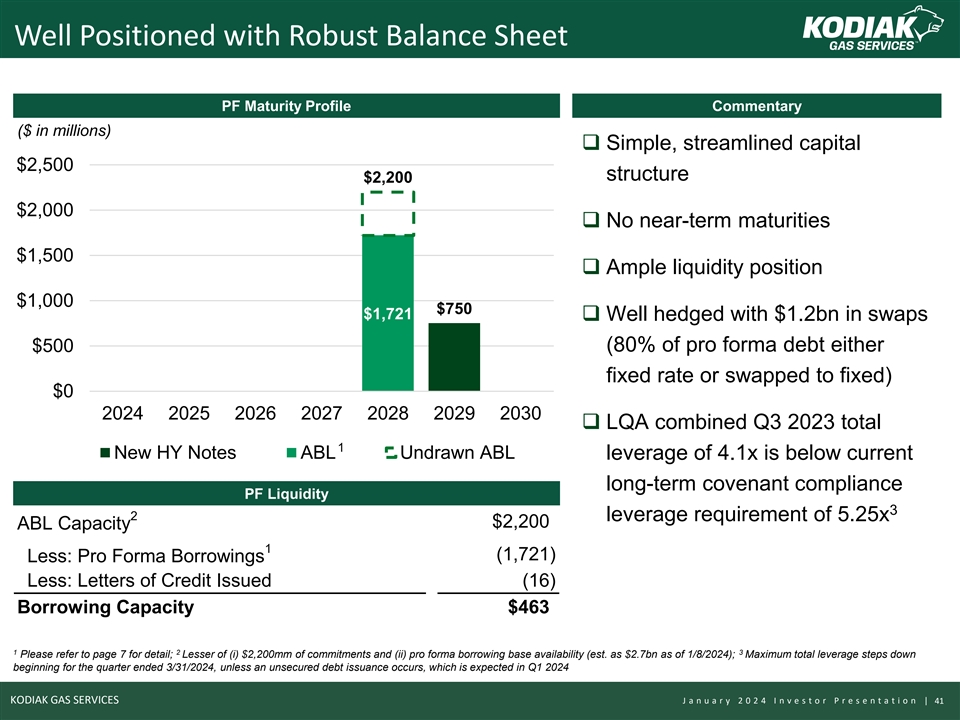 定位稳健的资产负债表PF到期情况简介评论(百万美元)丨简,精简资本$ 2,500结构$ 2,200 $ 2,000丨无近期到期$ 1,500丨充裕的流动性头寸$ 1,000 $ 750 $ 1,721丨用12亿美元的掉期$ 500进行了很好的对冲(80%的备考债务要么是固定利率或转为固定)0美元2024202520262027202820292030丨LQA合并2023年第三季度总计1新的HY票据ABL未提取ABL杠杆为4.1倍,低于当前长期契约合规性PF流动性32杠杆要求为5.25倍2,200美元ABL容量1(1,721)减:备考借款减:已签发的信用证(16)借款容量463123请详见第7页;(i)2,200mm美元承诺中较小者(ii)备考借款基础可用性(截至2024年8月1日估计为27亿美元);从截至2024年3月31日的季度开始,最高总杠杆逐步下降,除非发生无担保债务发行,预计2024年第一季度KODIAK GAS Services J A N U A R Y 202 4 I N V E S t o r P r e s e n t a t i o n | 41