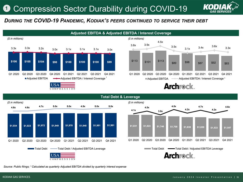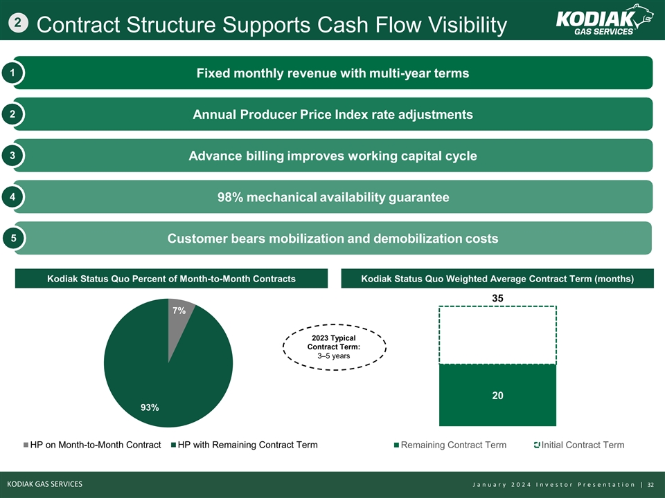 1在新冠疫情期间,压缩部门在新冠疫情期间的耐久性,KODIAK的同行继续为其债务调整后EBITDA和调整后EBITDA/利息覆盖率提供服务$ 2000.6 $ 0.53 $ 0.53 $ 0.53 $ 0.53 $ 0.53 $ 0.53 $ 0.53 $ 0.53 $ 0.53 $ 0.53 $ 0.53 $ 0.53 $ 0.53 $ 0.16 $ 180(百万美元)(百万美元)(百万美元)0.5 0.14 4.5x $ 1603.9x 3.8x $ 1400.12 $ 140 3.6x 3.5x 0.4 3.4x 3.3x 3.3x 3.3x 3.2x 3.1x 3.1x 3.1x 3.1x $ 120 3.0x 3.0x 0.10 $ 100.3 0.08 $ 800.06 $ 700.2 $ 60 $ 113 $ 106 $ 105 $ 104 $ 98 $ 100 $ 100 $ 100 $ 99 $ 101 $ 980.04 $ 92 $ 89 $ 87 $ 83 $ 400.10.02 $ 20 $ 00 $ 0 Q1 2020 Q2 2020 Q3 20202021年第一季度2021年第二季度2021年第三季度2021年第四季度2021年第一季度2020年第二季度2020年第三季度2020年第四季度2020年第一季度2021年第二季度2021年第三季度2021年第四季度11调整后EBITDA调整后EBITDA调整后EBITDA/利息覆盖率调整后EBITDA总债务和杠杆(百万美元)(百万美元)4.7x 5.0x 5.0x 4.9x 5.0x 4.8x $ 2,500 4.7x $ 2,500 4.6x 4.6x 4.5x $ 5.0 $ 5.0 4.2x 4.1x $ 4.5 3.9x $ 4.5 $ 2,000 $ 2,000 $ 4.0 $ 3.5 $ 3.5 $ 1,500 $ 1,500 $ 3.0 $ 2.5 $ 1,000 $ 1,000 $ 1,972 $ 1,949 $ 1,978 $ 1,948 $ 1,981 $ 1,991 $ 2.0 $ 1,934 $ 1,923 $ 2.0 $ 1,831 $ 1,823 $ 11,708美元1,638美元1,630美元1,547美元1,533美元1.5美元1.5美元500美元1.0美元500美元1.0美元0.5美元0.5美元0美元0.0美元0.0美元0美元0美元0美元0美元0美元0美元0美元0美元0美元0美元0美元0美元0美元0美元0美元0美元0美元0美元0美元0美元0美元0美元0美元0美元0美元0美元0美元0美元0美元0美元0美元0美元0美元0美元1美元1美元1美元1美元1美元1美元1美元1美元1美元1美元1美元1美元1美元1美元1美元1美元作为季度调整后EBITDA除以季度利息支出KODIAK GAS SERVICES J A N U A R Y 2024 I N V E S T O R P R E S E N T A T I O N | 31