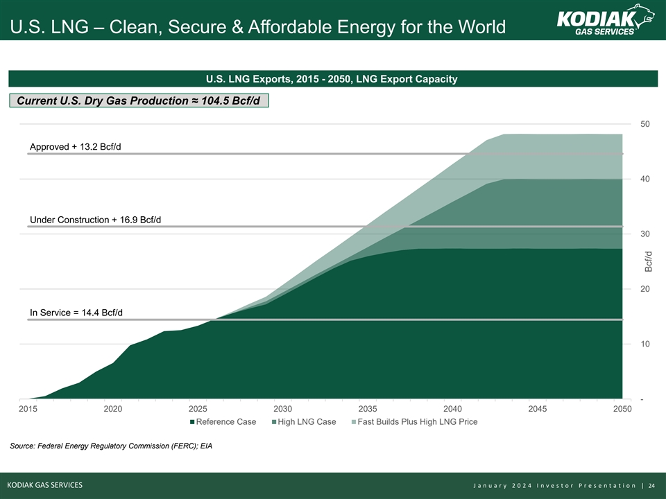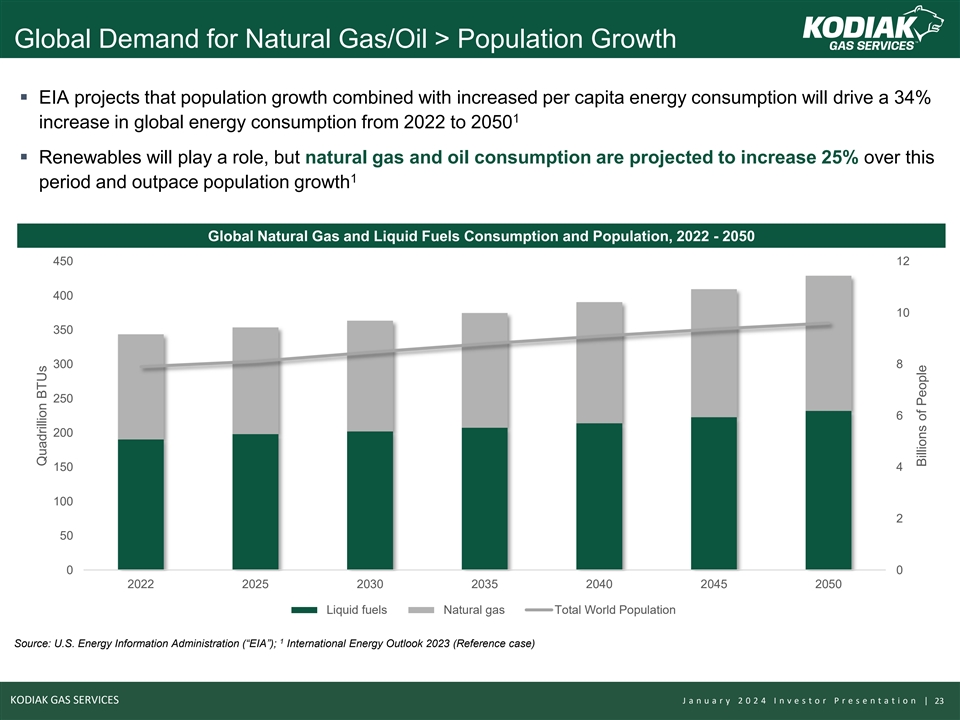全球对天然气/石油的需求>人口增长▪环评预计,人口增长加上人均能源消费增加将推动2022-2050年全球能源消费增长34% 1 ▪可再生能源将发挥作用,但预计天然气和石油消费在这1个时期内将增长25%,并超过人口增长全球天然气和液体燃料消费和人口,2022-20504501240010350300825062001504100250002022202520302035204020452050液体燃料天然气世界总人口1资料来源:美国能源信息署(“环评”);国际能源展望2023(参考案例)KODIAK GAS Services J A N U A R Y 202 4 I N V E S t o r P r e s e n t a t i o n | 23 Quadrillion BTU亿人