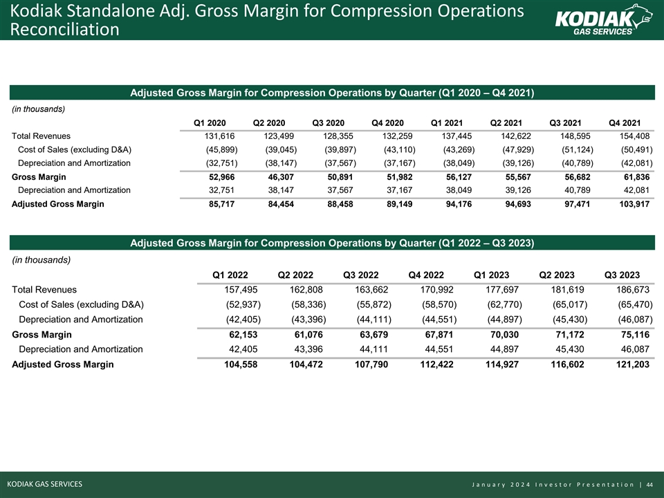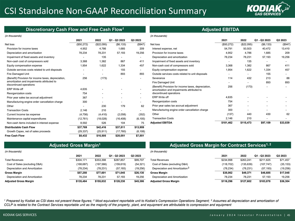 Kodiak独立调整后压缩业务毛利率(2020年第一季度– 2021年第四季度)(单位:千)2020年第一季度2020年第二季度2020年第三季度2020年第四季度2020年第一季度2021年第二季度2021年第三季度2021年第四季度2021年第四季度总收入131,616123,499128,355132,259137,445142,622148,595154,408销售成本(不含D & A)(45,899)(39,045)(39,897)(43,110)(43,269)(47,929)(51,124)(50,491)折旧和摊销(32,751)(38,147)(37,567)(37,167)(38,049)(39,126)(40,789)(42,081)毛利率52,96646,30750,89及摊销32,75138,14737,56737,16738,04939,12640,78942,081调整后毛利率85,71784,45488,45889,14994,17694,69397,471103,917按季度(Q1 2022 – Q3 2023)的压缩业务调整后毛利率(千)Q1 2022 Q2 2022 Q3 2022 Q4 2022 Q1 2023 Q2 2023 Q3 2023总收入157,495162,808163,662170,992177,697181,619186,673销售成本(不含D & A)(52,937)(58,336)(55,872)(58,570)(62,770)(65,017)(65,470)折旧摊销(42,405)(43及摊销42,40543,39644,11144,55144,89745,43046,087调整后毛利率104,558104,472 107,790112,422114,927116,602121,203科迪克气体服务J A N U A R Y 2024 I N V E S T O R P R E S E N T A T I O N | 44