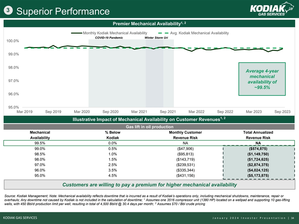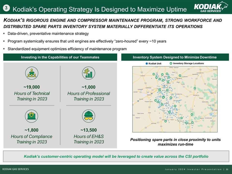 3 Kodiak的运营策略旨在最大限度地延长运行时间KodiAK严谨的发动机和压缩机维护计划,强大的劳动力和分散的备件库存系统使其运营在本质上有所不同▪数据驱动,预防性维护策略▪程序系统地确保单位发动机每~10年有效“零时”▪标准化设备优化维护计划效率投资于我们的队友库存系统的能力,旨在最大限度地减少停机时间~19000~1000小时专业培训的技术小时2023年培训~1800~13500小时EH & S定位备件在单位附近的合规小时2023年培训最大限度地提高运行时间2023年培训将利用Kodiak以客户为中心的运营模式在整个CSI投资组合中创造价值KODIAK GAS Services J A N U A R Y 202 4 I N V Es t o r p r e s e n t a t i o n | 33