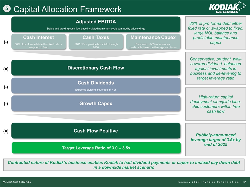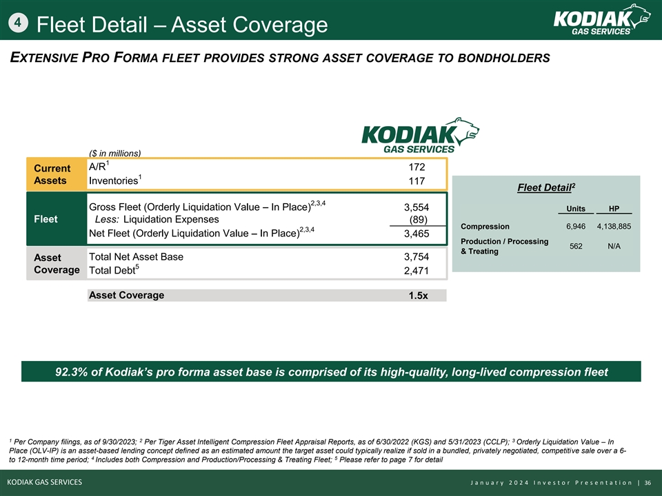 4车队细节–资产覆盖范围广泛PRO FORMA车队为债券持有人提供了强大的资产覆盖(百万美元)1 A/R 172流动1资产存货1172车队细节2,3,4总车队(有序清算价值–到位)3,554单位惠普车队减:清算费用(89)6,9464,138,885压缩2,3,4净车队(有序清算价值–到位)3,465生产/加工562不适用&处理总净资产基数3,754资产5覆盖总债务2,471资产覆盖1.5x 92.3% Kodiak的备考资产基础由其高质量,长寿命压缩车队123每个公司备案,截至2023年9月30日;Per Tiger资产智能压缩车队评估报告,截至2022年6月30日(KGS)和2023年5月31日(CCLP);有序清算价值–到位(OLV-IP)是一种基于资产的借贷概念,定义为如果以捆绑、私下协商的方式出售,目标资产通常可以实现的估计金额,6-4 5至12个月时间段内的竞争性销售;包括压缩和生产/加工和处理车队;详情请参阅第7页KODIAK GAS Services J A N U A R Y 202 4 I N V E S T O R P R E S E N T A T I O N | 36