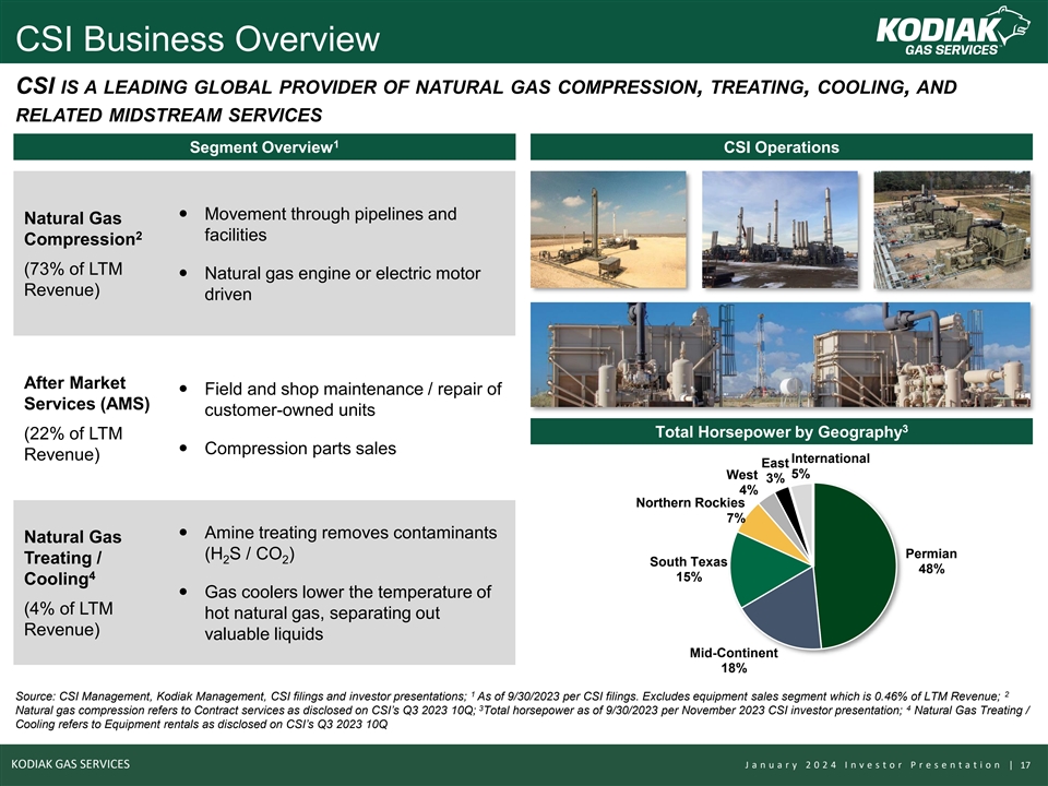 关键交易收益丨增强的现金流有助于实现到2025年底达到3.5倍的杠杆目标具有吸引力丨超2000万美元的高信心预期年度成本协同效应交易丨交易价值约为6.6倍CSI LTM2023年第三季度调整后EBITDA,不包括协同效应经济学丨预计将增加可自由支配的现金流和每股自由现金流丨增加机队规模和规模互补丨有机会在CSI的机队压缩资产中产生更高的利用率丨对大型惠普装置的投资和对小型惠普装置的剥离,使CSI的机队获得了高评级,从而加深了地理丨在二叠纪盆地和Eagle Ford页岩的存在扩大了Kodiak的现有足迹,丨与蓝筹客户的固定收入合同扩大了客户丨有限的客户重叠群丨通过CSI的天然气处理/冷却提供更广泛的服务的自然延伸和后市场服务多元化服务丨提供交叉销售机会的潜力KODIAK GAS Services J A N U A R Y 202 4 I N V E S T O R P R E S E N T A T I O N | 16