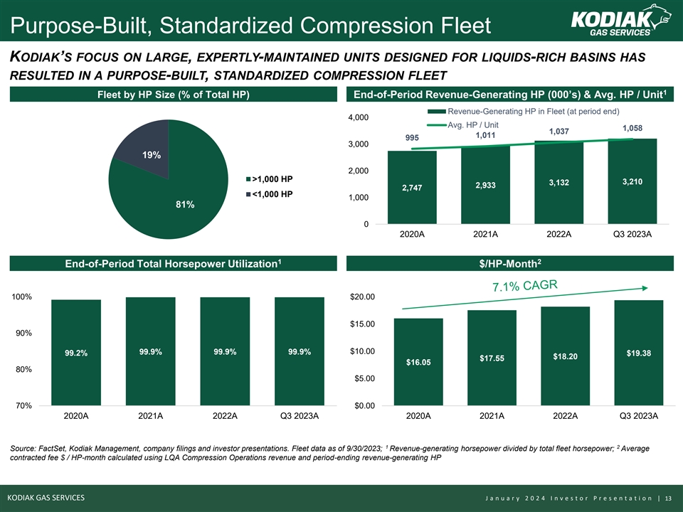 Kodiak概述国内能源基础设施的领先供应商,从数字上看:1 ▪ NYSE:KGS ▪企业价值:35亿美元2 ▪流通股:7740万▪ LQA2023 Q3 Adj. EBITDA:4.4亿美元33.2mm收入产生惠普 12 ▪市值:17亿美元▪净债务/LQA2023 Q3 Adj. EBITDA:4.0x以HP为重点的大型车队,拥有31,058 惠普/单位平均粉河流域固定收入合同7% 216k 惠普 Appalachian Basin 2% 80k TERM3 11.6% 2020A – Q3 2023 DJ DJ basin 2% 4 50k 惠普 Adj. EBITDA51.1%评级投资级42k 惠普 Haynesville/1% Cotton Valley 71% Permian Basin 6 18k 惠普 99% + 4年平均利用率2272k 惠普收入-13 % x % 2产生惠普TERM3 Eagle Ford 0.28%不良客户427k 惠普 7注销12资料来源:公司文件,Kodiak Management,Bloomberg;基于KGS截至2024年1月18日的股价;反映截至2023年9月30日Kodiak数据的现状。见第43345页开始的附录用于调节非公认会计原则措施;截至2023年9月30日;反映LTM 2023年第三季度调整后EBITDA数字;反映2023年第三季度压缩业务收入的百分比来自67个投资级评级客户每个Kodiak Management;反映2019年第三季度– 2023年第三季度月利用率的平均值;反映2015 – 2023年第三季度坏账费用占总收入的百分比KODIAK GAS Service J A N U A R Y 202 4 I N V E S T O R P R E S E N T A T I O N | 12
