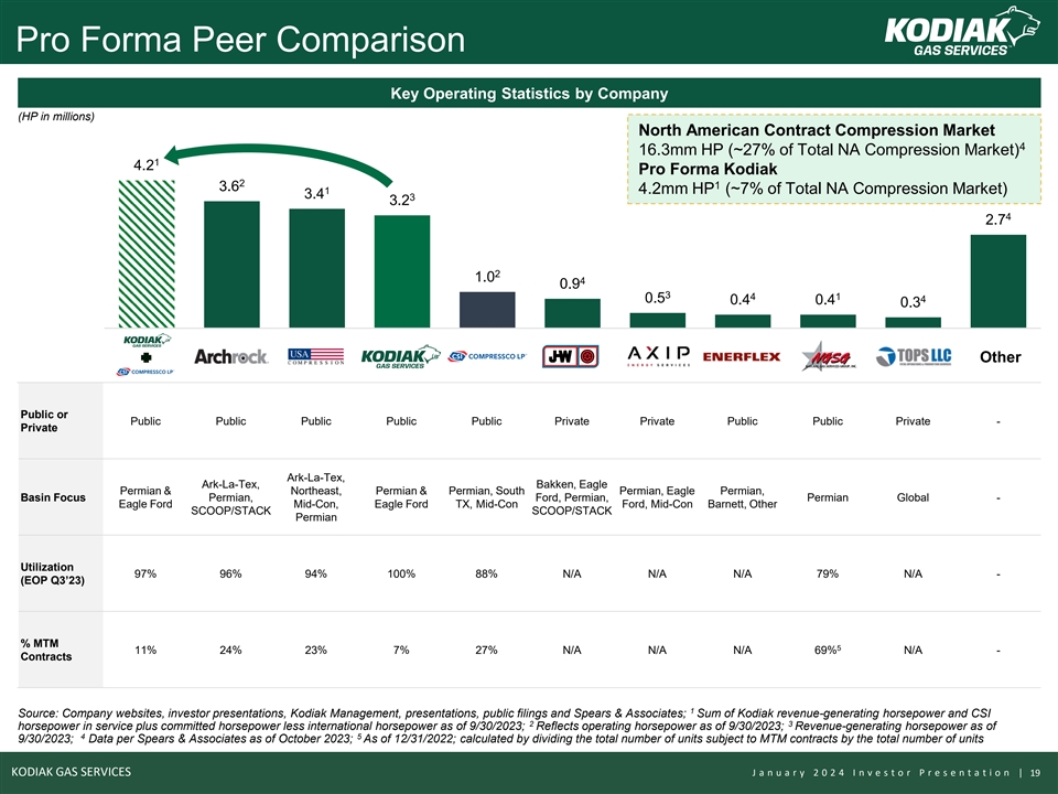 备考马力中证中证70k 惠普 Northern Rockies 71k 惠普其他336k TERM2 Kodiak 211k 惠普 Kodiak 266k 惠普 140k 惠普 CSI CSI 190k 惠普 Mid-Continent 48k 惠普 International 295k 惠普 Kodiak 48k 惠普 Kodiak 105k 惠普0 None CSI 157k 惠普 Eagle Ford 507k 惠普 Permian 583k 惠普 Kodiak 2,779k 惠普 Kodiak Kodiak总部427k 惠普 2,272k 惠普截至2023年9月30日,Kodiak和运营马力加上CSI的承诺马力;其他类别包括CSI数字确定为东部和西部,以及Kodiak数字确定为Appalachia、Haynesville和其他Kodiak GAS服务J a n u a r y 202 4 i n v e s t o r p r e s e n t a t i o n | 18