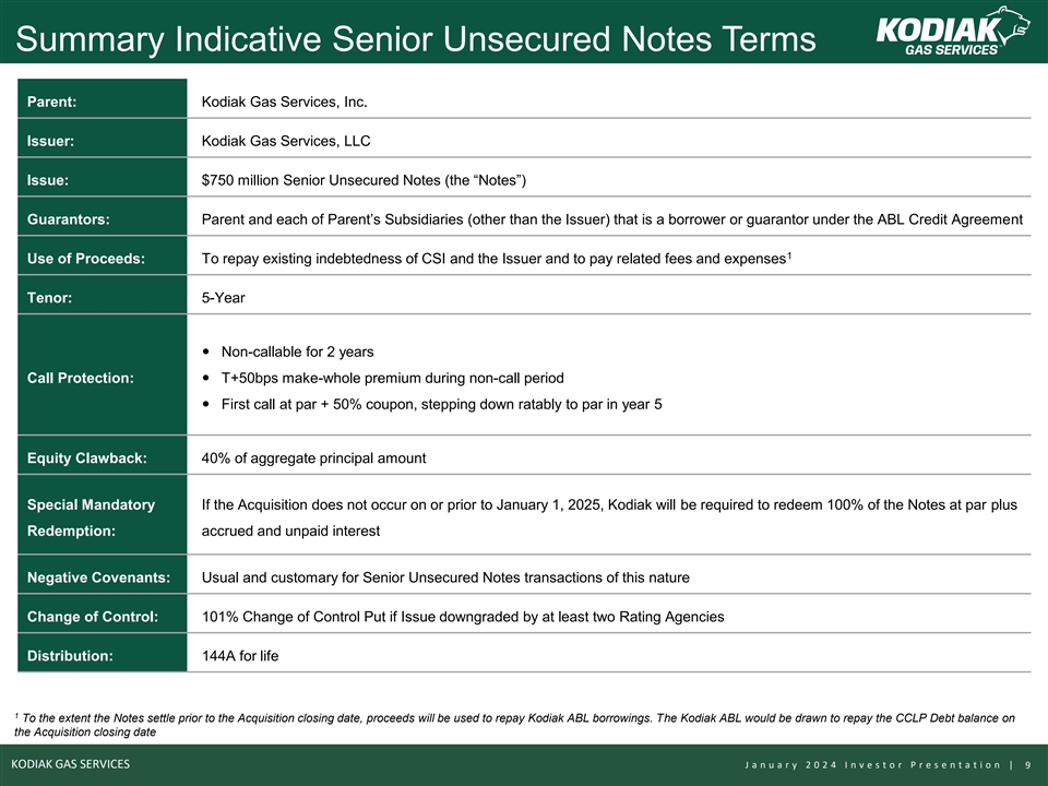 备考组织结构Structure Spartan Energy & Other CCLP公众股东Kodiak Public Shareholders 1,2 CCLPTERM3 Substants Guarants Shareholders Kodiak Public Shareholders 1,2 TERM3 Substants 1 Restricted Group 1 Spartan Energy是一家总部位于德克萨斯州的私营公司,成立于2010年,是一家全球性的气体处理、压缩和处理服务供应商,该公司是一家总部位于德克萨斯州的私营公司。Spartan通过其GP权益成为2家CCLP的控股股东。Spartan的大股东是Silverhawk Capital Partners;Spartan Energy & Other CCLP选举股东将拥有OPCO单位和同等数量的Kodiak优先股。这些股东将通过这些文书拥有同等比例的投票权和经济权利。优先股将对Kodiak的普通股拥有平等的3个投票权,但没有经济权利。OPCO单位提供经济权利,但没有投票权;假设所有合资格股东选择参与UP-C结构对价KODIAK GAS Services J A N U A R Y 2024 I N V E S T O R P R E S E N T A T I O N | 8