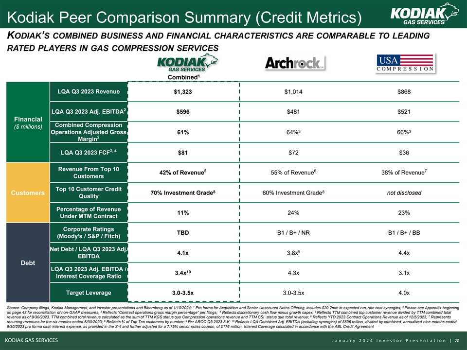 按公司分列的备考同行比较关键运营统计数据(惠普百万)北美合同压缩市场4 16.3mm 惠普(~NACompression Market Total 27%)14.2备考Kodiak 213.61 4.2mm 惠普(~NACompression Market Total 7%)3.43 3.24 2.72 1.04 0.93 410.54 0.4 0.4 0.3其他公共或公共公共公共公共公共公共公共公共公共私人公共私人公共私人-私人Ark-La-Tex,Ark-La-Tex,Bakken,Eagle Permian & Northeast,Permian & Permian,South Permian,Eagle Permian,Basin Focus Permian,Ford,Permian,Permian Global-Eagle Ford Mid-Con,Eagle Ford TX,Mid-Con Ford,Mid-Con Barnett,Other SCOOP/STACK SCOOP/STACK Permian Utilization 97% 96% 94% 100% 88% N/A N/A N/A 79% N/A-(EOP Q3’23)% MTM 511% 24% 23% 7% 27% N/A N/A N/A 69% N/A-Contracts 1 Source:Company websites,investor presentations,Kodiak Management,presentations,公开文件和Spears & Associates;Kodiak创收马力总和和CSI 23在役3匹马力加上承诺马力减去截至2023年9月30日的国际马力;反映截至2023年9月30日的运营马力;截至2023年9月30日的创收马力;截至2023年10月的数据per Spears & Associates;截至2022年12月31日;计算方法为受MTM合同约束的机组总数除以KODIAK GAS Service J A N U A R Y 202 4 i n v e s t o r P r e s e n t a t i o n | 19