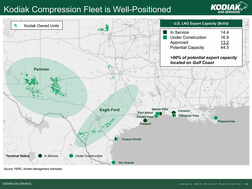 压缩市场必须增长才能满足美国天然气需求▪ Spears & Associates估计,2023年美国天然气压缩市场总量约为5700万马力▪这意味着美国干气产量每BCF/d的“压缩强度”约为56万马力▪供应在建液化天然气出口终端的原料气将推动显着的增量压缩需求▪在目前的压缩强度下,向在建LNG工厂供货需要~1700万惠普压缩并经FERC美国天然气市场批准1508074675700万惠普 = 70125~560k 惠普 per BCF/d 5760100504675401321193010250100959392842074747225100-Plus Plus 201520162017201820192020202120222023 Existing + Existing + L LNG NG Un und de er r L LNG NG Un und de er r cons stru truc cti tio on n cons stru truc cti tio on n US dry gas production total installedCompression 惠普 & Approved & Approved来源:Spears & Associates上游气体压缩市场:2023年10月;Kodiak Management estimates KODIAK GAS SERVICES J A n u a r y202 4 i n v e s t o r p r e s e n t a t i o n | 25 bcf/d百万惠普