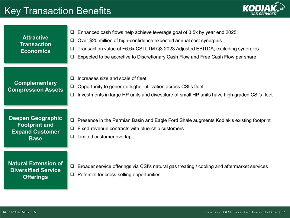 获得行业领导地位的财务增值途径凸显北美最大机队~4.2mm收入-1丨2023年12月19日,Kodiak宣布进行一项全股权收购,以产生价值8.54亿美元的CSI Compressco LP的惠普~3.2mm 惠普~1.0mm 惠普(基于12月18日的市场价格)二叠纪盆地最大的运营商丨经公告的购买价格约为CSI 2 LTM 2023年第三季度调整后的6.6x倍。EBITDA~2.8mm二叠纪TERM0惠普~2.3mm 丨惠普~0.5mm 惠普丨预计将创造国内最大的合同压缩车队,其创收马力为1420万匹,在同行中利用率最高丨预计将于2024年Q2结束96.6%利用率99.9% 87.6%利用率12 Kodiak创收马力之和和CSI在役马力加上承诺马力减去截至2023年9月30日的国际马力;不包括协同效应KODIAK GAS SERVICES J A N U A R Y 2024 I N V E S T O R P R E S E N T A T I O N | 15