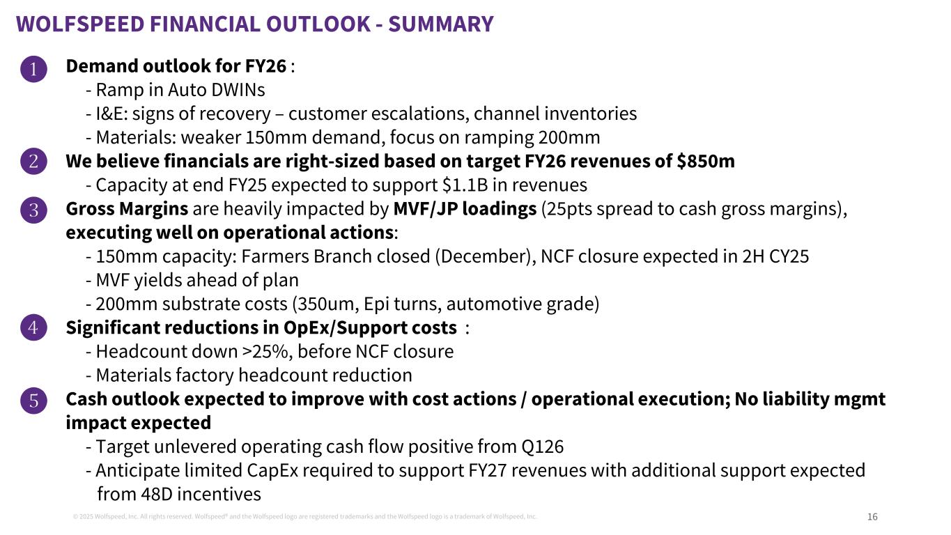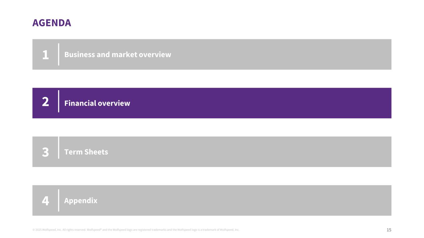 ©2025 Wolfspeed, Inc.版权所有。Wolfspeed®并且Wolfspeed徽标为注册商标,Wolfspeed徽标为Wolfspeed, Inc.15议程业务和市场概览财务概览条款清单123附录4的商标