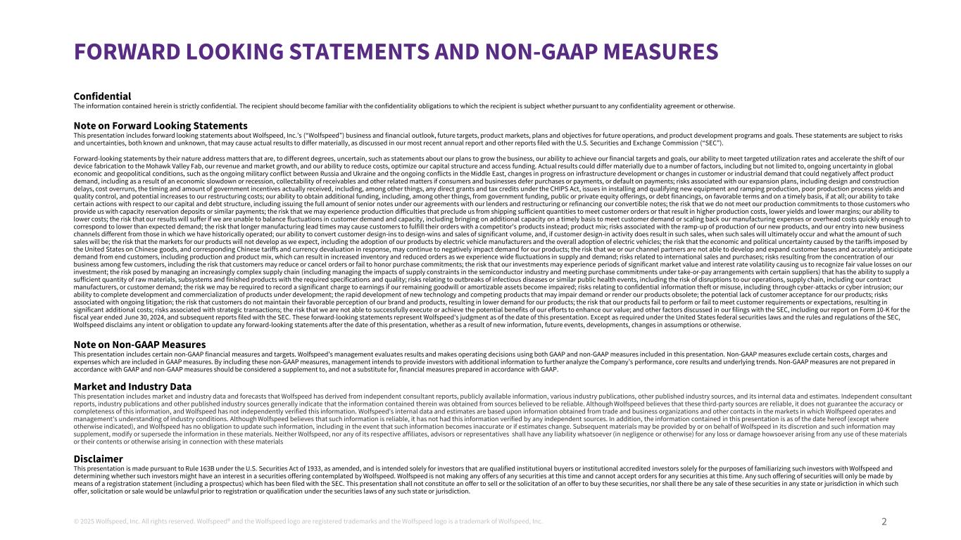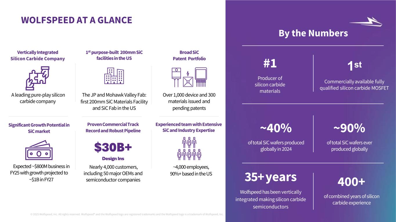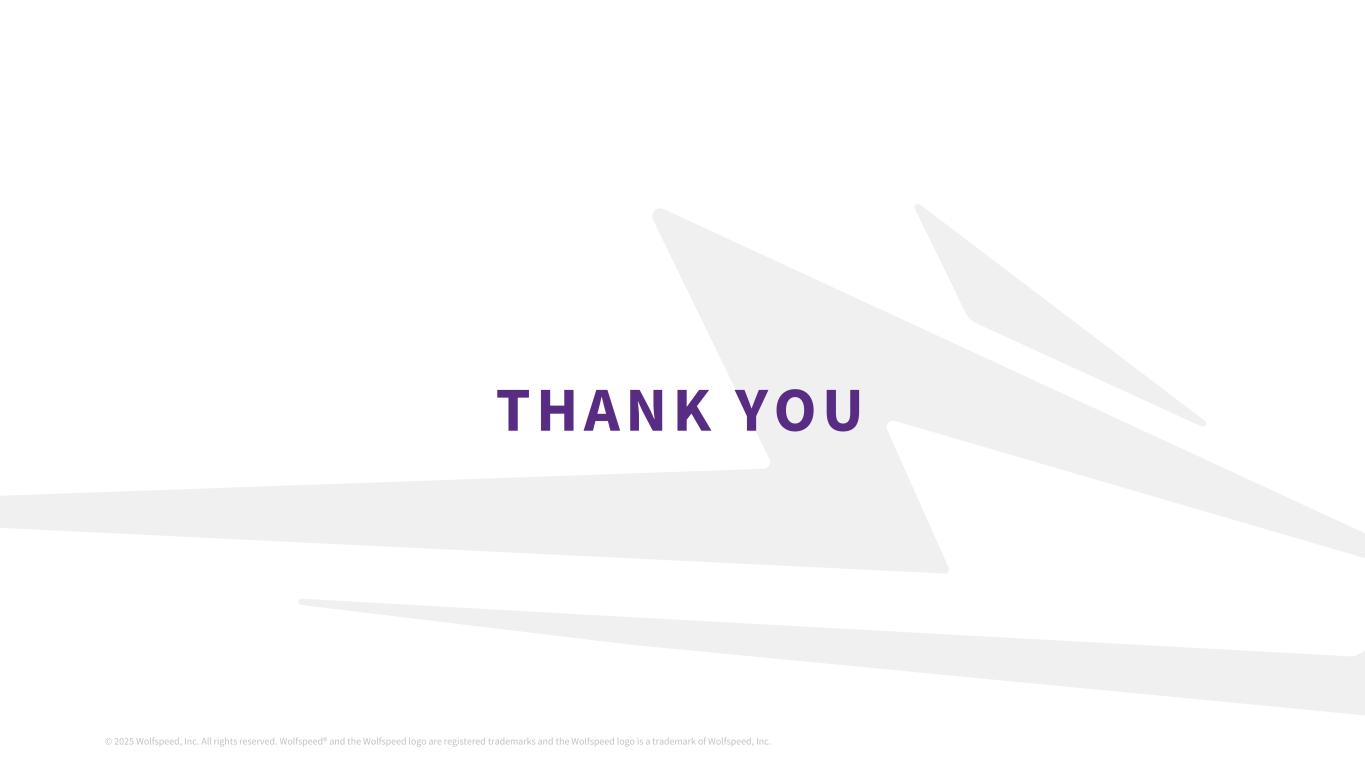 ©2025 Wolfspeed, Inc.版权所有。Wolfspeed®并且Wolfspeed徽标是注册商标,Wolfspeed徽标是Wolfspeed, Inc.前瞻性陈述和非公认会计原则措施a的商标。此处包含的信息为严格保密信息。收件人应熟悉收件人所承担的保密义务,无论是否根据任何保密协议或其他方式。关于前瞻性陈述的说明本演示文稿包括有关Wolfspeed, Inc.(“Wolfspeed”)的业务和财务前景、未来目标、产品市场、未来运营的计划和目标以及产品开发计划和目标的前瞻性陈述。正如我们最近提交给美国证券交易委员会(“SEC”)的年度报告和其他报告中所讨论的,这些陈述受到已知和未知的风险和不确定性的影响,可能导致实际结果存在重大差异。就其性质而言,前瞻性陈述涉及在不同程度上不确定的事项,例如关于我们发展业务的计划、我们实现财务目标和目标的能力、我们达到目标利用率并加速将我们的设备制造转移到莫霍克山谷晶圆厂的能力、我们的收入和市场增长,以及我们降低成本、优化资本结构和获得资金的能力的陈述。由于多种因素,实际结果可能存在重大差异,包括但不限于全球经济和地缘政治状况的持续不确定性,例如俄罗斯和乌克兰之间持续的军事冲突以及中东持续的冲突、基础设施发展进展的变化或可能对产品需求产生负面影响的客户或工业需求的变化,包括由于经济放缓或衰退、如果消费者和企业推迟购买或付款或拖欠付款,应收款项的可收回性和其他相关事项;与我们的扩张计划相关的风险,包括设计和建设延误、成本超支、实际收到的政府奖励的时间和金额,其中包括根据《CHIPS法案》获得的任何直接赠款和税收抵免、安装和合格新设备和提高产量方面的问题、糟糕的生产过程产量和质量控制,以及我们重组成本的潜在增加;我们以优惠条件和及时获得额外资金的能力,其中包括从政府资金、公共或私募股权发行或债务融资,如果有的话;我们就我们的资本和债务结构采取某些行动的能力,包括根据我们与贷方的协议发行全额优先票据以及重组或再融资我们的可转换票据;我们未能履行对那些向我们提供产能预留保证金或类似付款的客户的生产承诺的风险;我们可能遇到生产困难从而无法运送足够数量以满足客户订单或导致更高生产成本的风险,较低的产量和较低的利润率;我们降低成本的能力;如果我们无法平衡客户需求和产能的波动,包括及时带来额外产能以满足客户需求或足够快地缩减我们的制造费用或间接费用以对应低于预期的需求,我们的业绩将受到影响的风险;较长的制造准备时间可能导致客户转而以竞争对手的产品履行订单的风险;产品组合;与我们的新产品的产量提升相关的风险,以及我们进入与我们以往经营的渠道不同的新业务渠道;我们将客户设计-ins转换为设计-赢得和大量销售的能力,以及,如果客户设计-in活动确实导致此类销售,最终何时会发生此类销售以及此类销售的数量将是多少;我们产品的市场不会像我们预期的那样发展的风险,包括电动汽车制造商采用我们的产品以及整体采用电动汽车;美国对中国商品征收关税所带来的经济和政治不确定性以及相应的中国关税和货币贬值可能继续对我们产品的需求产生负面影响的风险;我们或我们的渠道合作伙伴无法开发和扩大客户群并准确预测终端客户的需求的风险,包括生产和产品组合, 这可能导致库存增加和订单减少,因为我们经历了供需的广泛波动;与国际销售和采购相关的风险;由于我们的业务集中于少数客户而导致的风险,包括客户可能减少或取消订单或未能履行采购承诺的风险;我们的投资可能经历重大市场价值和利率波动期间导致我们对投资确认公允价值损失的风险;管理日益复杂的供应链(包括管理半导体行业供应限制的影响以及根据与某些供应商的照付不议安排履行采购承诺)所带来的风险,该供应链有能力供应足够数量的原材料,具备所需规格和质量的子系统和成品;与传染病爆发或类似公共卫生事件相关的风险,包括我们的运营、供应链(包括我们的合同制造商)或客户需求中断的风险;如果我们剩余的商誉或可摊销资产发生减值,我们可能被要求在收益中记录重大费用的风险;与机密信息被盗或滥用相关的风险,包括通过网络攻击或网络入侵;我们完成在研产品的开发和商业化的能力;可能损害需求或使我们的产品过时的新技术和竞争产品的快速发展;客户对我们的产品可能缺乏认可;与正在进行的诉讼相关的风险;客户未能保持对我们的品牌和产品的良好认知,从而导致对我们产品的需求下降的风险;我们的产品未能履行或未能满足客户要求或期望的风险,导致显着额外成本;与战略交易相关的风险;我们无法成功执行或实现我们努力提升价值的潜在收益的风险;以及我们在提交给SEC的文件中讨论的其他因素,包括我们截至2024年6月30日的财政年度的10-K表格报告,以及随后向SEC提交的报告。这些前瞻性陈述代表Wolfspeed在本演示文稿发布之日的判断。除美国联邦证券法和SEC规则和条例要求外,Wolfspeed不承担在本演示文稿日期之后更新任何前瞻性陈述的任何意图或义务,无论是由于新信息、未来事件、发展、假设变化或其他原因。关于非公认会计原则措施的说明本演示文稿包括某些非公认会计原则财务措施和目标。Wolfspeed的管理层使用本演示文稿中包含的GAAP和非GAAP衡量标准来评估结果并做出