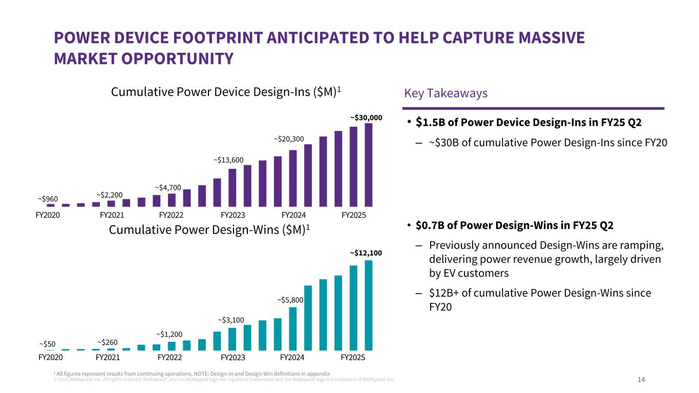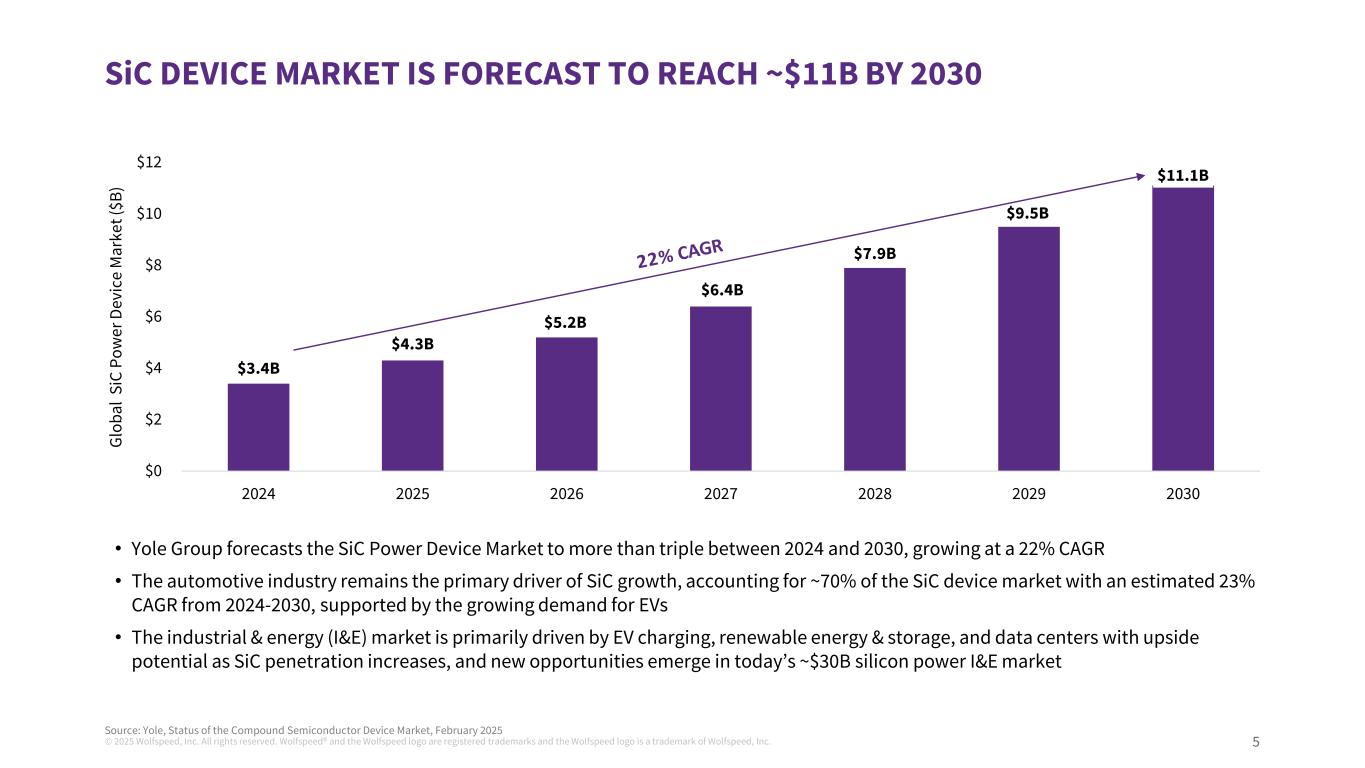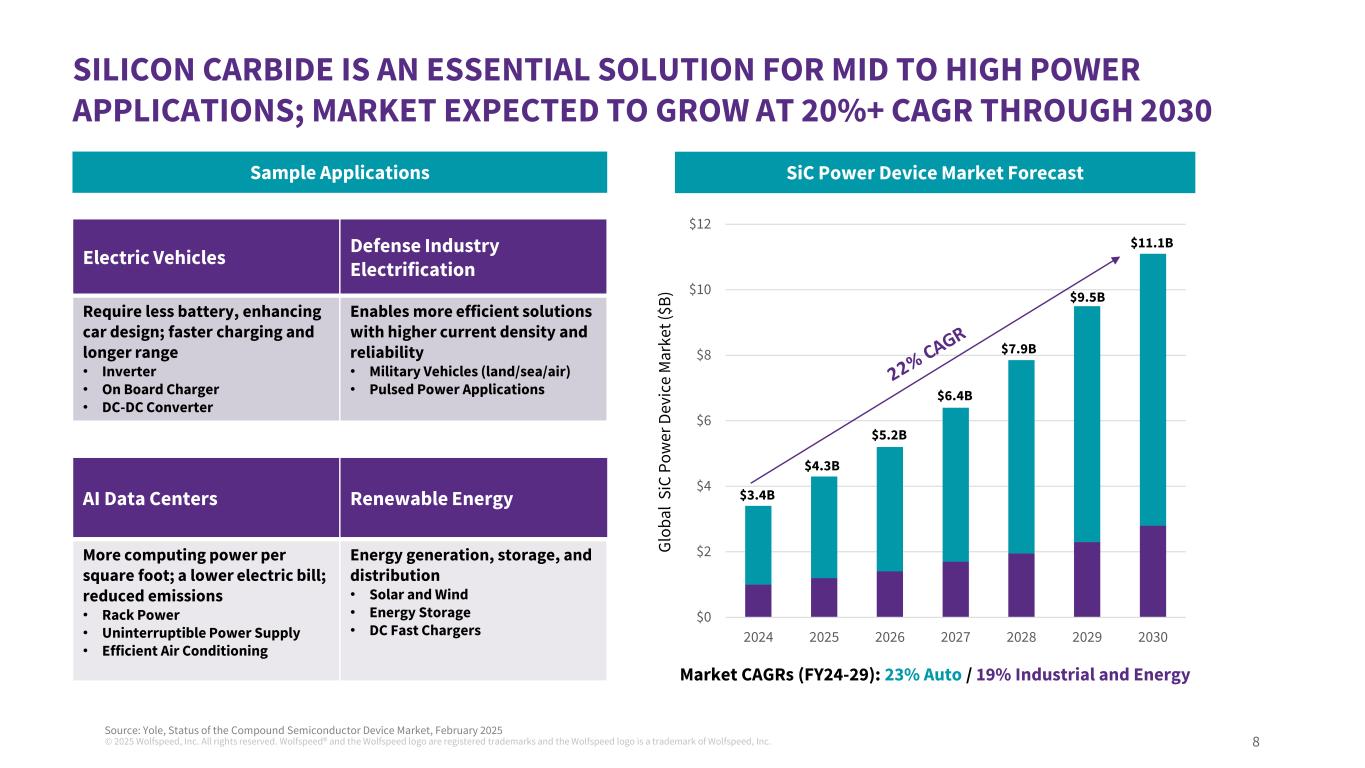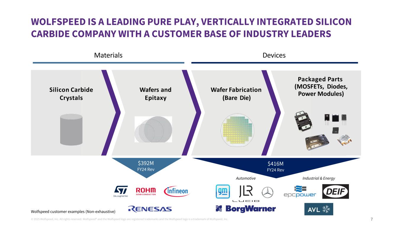 ©2025 Wolfspeed, Inc.版权所有。Wolfspeed®并且Wolfspeed徽标是注册商标,Wolfspeed徽标是Wolfspeed, Inc.前瞻性陈述和非公认会计原则措施a的商标。此处包含的信息为严格保密信息。收件人应熟悉收件人所承担的保密义务,无论是否根据任何保密协议或其他方式。关于前瞻性陈述的说明本演示文稿包括有关Wolfspeed, Inc.(“Wolfspeed”)的业务和财务前景、未来目标、产品市场、未来运营的计划和目标以及产品开发计划和目标的前瞻性陈述。正如我们最近提交给美国证券交易委员会(“SEC”)的年度报告和其他报告中所讨论的,这些陈述受到已知和未知的风险和不确定性的影响,可能导致实际结果存在重大差异。就其性质而言,前瞻性陈述涉及在不同程度上不确定的事项,例如关于我们发展业务的计划、我们实现财务目标和目标的能力、我们达到目标利用率并加速将我们的设备制造转移到莫霍克山谷晶圆厂的能力、我们的收入和市场增长,以及我们降低成本、优化资本结构和获得资金的能力的陈述。由于多种因素,实际结果可能存在重大差异,包括但不限于全球经济和地缘政治状况的持续不确定性,例如俄罗斯和乌克兰之间持续的军事冲突以及中东持续的冲突、基础设施发展进展的变化或可能对产品需求产生负面影响的客户或工业需求的变化,包括由于经济放缓或衰退、如果消费者和企业推迟购买或付款或拖欠付款,应收款项的可收回性和其他相关事项;与我们的扩张计划相关的风险,包括设计和建设延误、成本超支、实际收到的政府奖励的时间和金额,其中包括根据《CHIPS法案》获得的任何直接赠款和税收抵免、安装和合格新设备和提高产量方面的问题、糟糕的生产过程产量和质量控制,以及我们重组成本的潜在增加;我们以优惠条件和及时获得额外资金的能力,其中包括从政府资金、公共或私募股权发行或债务融资,如果有的话;我们就我们的资本和债务结构采取某些行动的能力,包括根据我们与贷方的协议发行全额优先票据以及重组或再融资我们的可转换票据;我们未能履行对那些向我们提供产能预留保证金或类似付款的客户的生产承诺的风险;我们可能遇到生产困难从而无法运送足够数量以满足客户订单或导致更高生产成本的风险,较低的产量和较低的利润率;我们降低成本的能力;如果我们无法平衡客户需求和产能的波动,包括及时带来额外产能以满足客户需求或足够快地缩减我们的制造费用或间接费用以对应低于预期的需求,我们的业绩将受到影响的风险;较长的制造准备时间可能导致客户转而以竞争对手的产品履行订单的风险;产品组合;与我们的新产品的产量提升相关的风险,以及我们进入与我们以往经营的渠道不同的新业务渠道;我们将客户设计-ins转换为设计-赢得和大量销售的能力,以及,如果客户设计-in活动确实导致此类销售,最终何时会发生此类销售以及此类销售的数量将是多少;我们产品的市场不会像我们预期的那样发展的风险,包括电动汽车制造商采用我们的产品以及整体采用电动汽车;美国对中国商品征收关税所带来的经济和政治不确定性以及相应的中国关税和货币贬值可能继续对我们产品的需求产生负面影响的风险;我们或我们的渠道合作伙伴无法开发和扩大客户群并准确预测终端客户的需求的风险,包括生产和产品组合, 这可能导致库存增加和订单减少,因为我们经历了供需的广泛波动;与国际销售和采购相关的风险;由于我们的业务集中于少数客户而导致的风险,包括客户可能减少或取消订单或未能履行采购承诺的风险;我们的投资可能经历重大市场价值和利率波动期间导致我们对投资确认公允价值损失的风险;管理日益复杂的供应链(包括管理半导体行业供应限制的影响以及根据与某些供应商的照付不议安排履行采购承诺)所带来的风险,该供应链有能力供应足够数量的原材料,具备所需规格和质量的子系统和成品;与传染病爆发或类似公共卫生事件相关的风险,包括我们的运营、供应链(包括我们的合同制造商)或客户需求中断的风险;如果我们剩余的商誉或可摊销资产发生减值,我们可能被要求在收益中记录重大费用的风险;与机密信息被盗或滥用相关的风险,包括通过网络攻击或网络入侵;我们完成在研产品的开发和商业化的能力;可能损害需求或使我们的产品过时的新技术和竞争产品的快速发展;客户对我们的产品可能缺乏认可;与正在进行的诉讼相关的风险;客户未能保持对我们的品牌和产品的良好认知,从而导致对我们产品的需求下降的风险;我们的产品未能履行或未能满足客户要求或期望的风险,导致显着额外成本;与战略交易相关的风险;我们无法成功执行或实现我们努力提升价值的潜在收益的风险;以及我们在提交给SEC的文件中讨论的其他因素,包括我们截至2024年6月30日的财政年度的10-K表格报告,以及随后向SEC提交的报告。这些前瞻性陈述代表Wolfspeed在本演示文稿发布之日的判断。除美国联邦证券法和SEC规则和条例要求外,Wolfspeed不承担在本演示文稿日期之后更新任何前瞻性陈述的任何意图或义务,无论是由于新信息、未来事件、发展、假设变化或其他原因。关于非公认会计原则措施的说明本演示文稿包括某些非公认会计原则财务措施和目标。Wolfspeed的管理层使用本演示文稿中包含的GAAP和非GAAP衡量标准来评估结果并做出