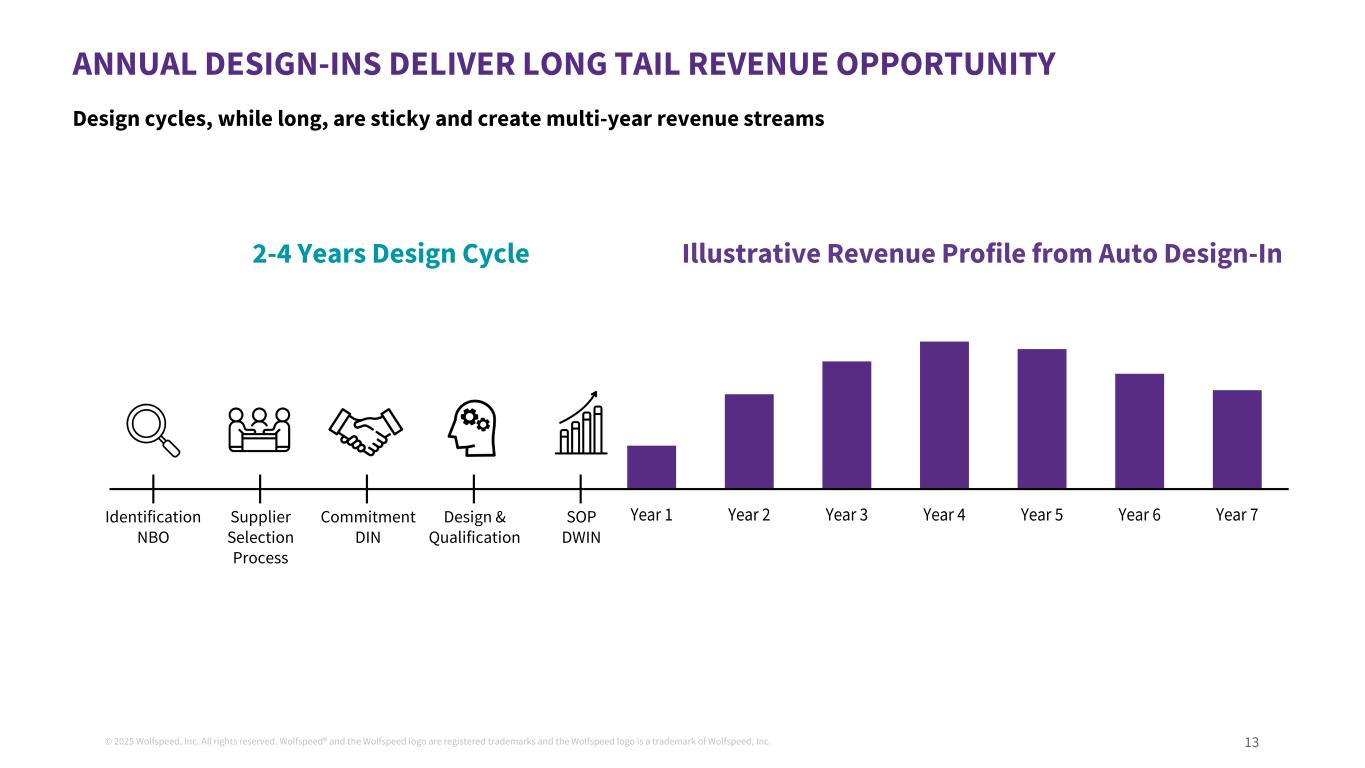 ©2025 Wolfspeed, Inc.版权所有。Wolfspeed®并且Wolfspeed徽标是注册商标并且Wolfspeed徽标是TERM0设计INS交付长尾收入机会的商标13来自汽车设计的说明性收入概况-in2-4年的设计周期设计周期,虽然长,但具有粘性并创造多年收入流年份1年2年3年4年5年6年7识别NBO供应商选择过程承诺DIN设计&资格SOP DWIN