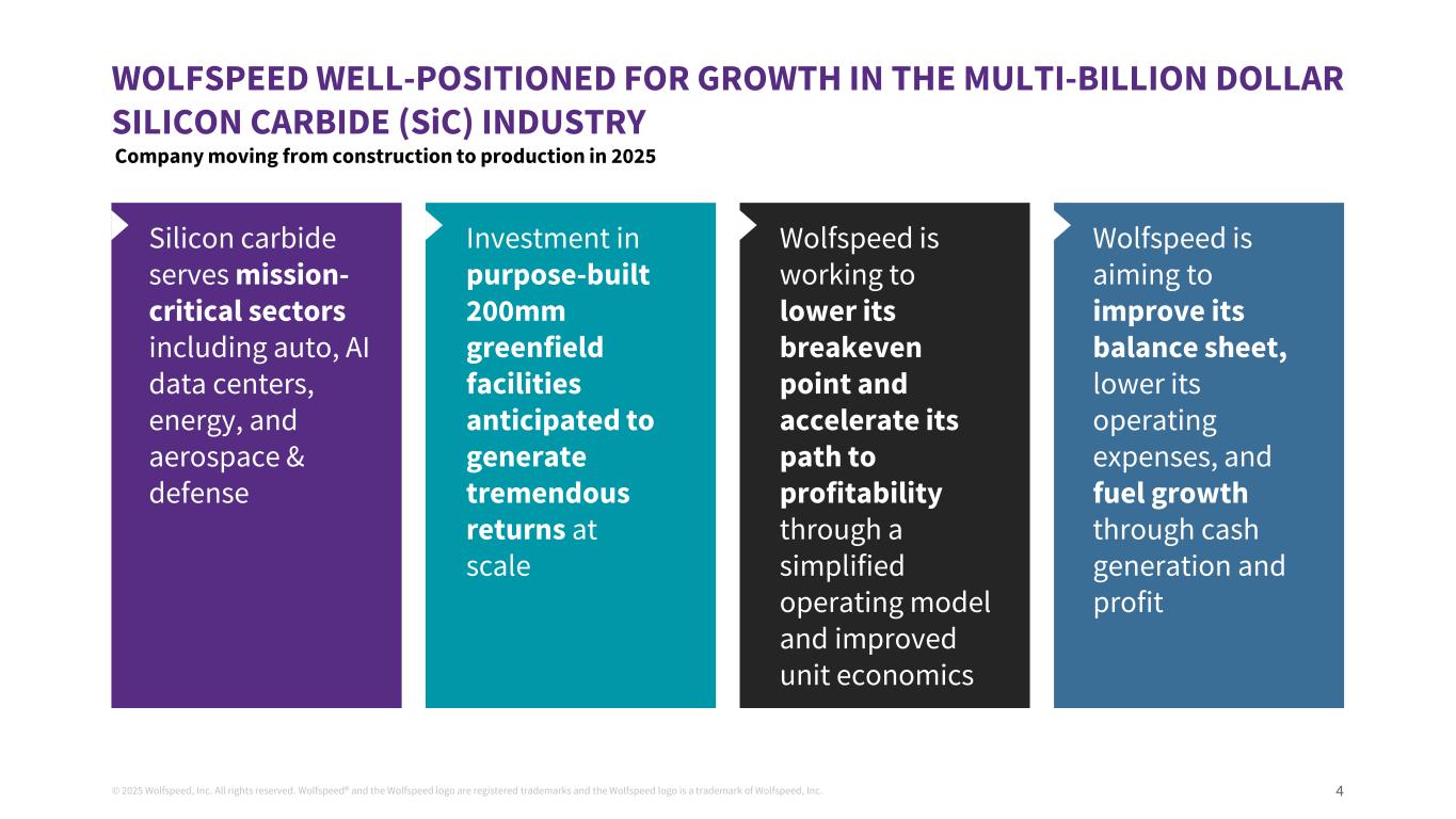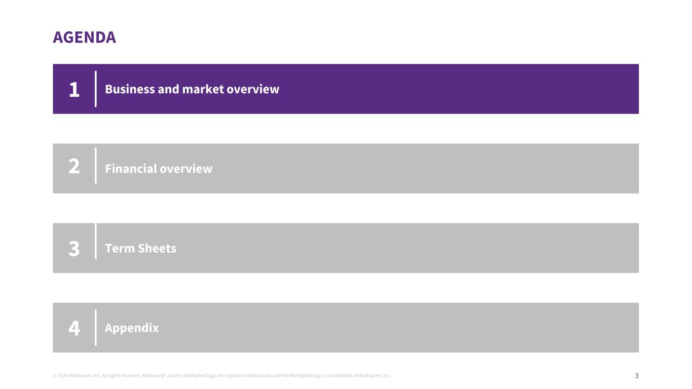 ©2025 Wolfspeed, Inc.版权所有。Wolfspeed®并且Wolfspeed徽标为注册商标,Wolfspeed徽标为Wolfspeed, Inc.议程3业务和市场概览财务概览条款清单123附录4的商标