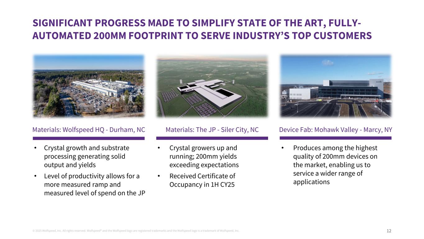 ©2025 Wolfspeed, Inc.版权所有。Wolfspeed®并且Wolfspeed徽标是注册商标,而Wolfspeed徽标是Wolfspeed, Inc. 11的商标,该商标采用200mm的FIRST MOVER Advantage allows for Significant Volume Trajectory 20232024202520262027 + Czech Republic – Multi-Year SiC Investment Easton,PA – Production begin Q3’24 Miyazaki plant – Production in FY25 Chikugo plant – Production in FY25 The JP Siler City – Begin H1’25 and 10x production Gumi,Korea & Bay City,密歇根–将于2025年开始生产200mm SiC器件生产开始200mm SiC器件生产启动来源:时间轴来自公开财报电话会议、公司投资者关系材料、Yole Power SiC 2024报告和新闻报道。MHV – Jun’24 20%使用率,Q1达到25%’25 MHV-投产MHV晶圆厂进展马来西亚库利姆-200mm晶圆厂于Q3’24启用2022 200mm SiC材料生产开始*这颗星星标志着以可扩展的汽车质量生产200mm晶圆,因为Wolfspeed和相干公司都已生产出初始200mm碳化硅衬底,明显早于表示的200mm SiC材料生产启动*北卡罗来纳州达勒姆总部*韩国– 24年第四季度开始生产奥地利维拉赫– 25年第一季度开始生产意大利卡塔尼亚–由H2’25重庆生产–工厂于25年第一季度启用,Q4‘25量产深圳晶圆厂– H1’26投产注:所有前瞻性日期均为预期日期,以公司公告或新闻报道为基础,可能会发生变化