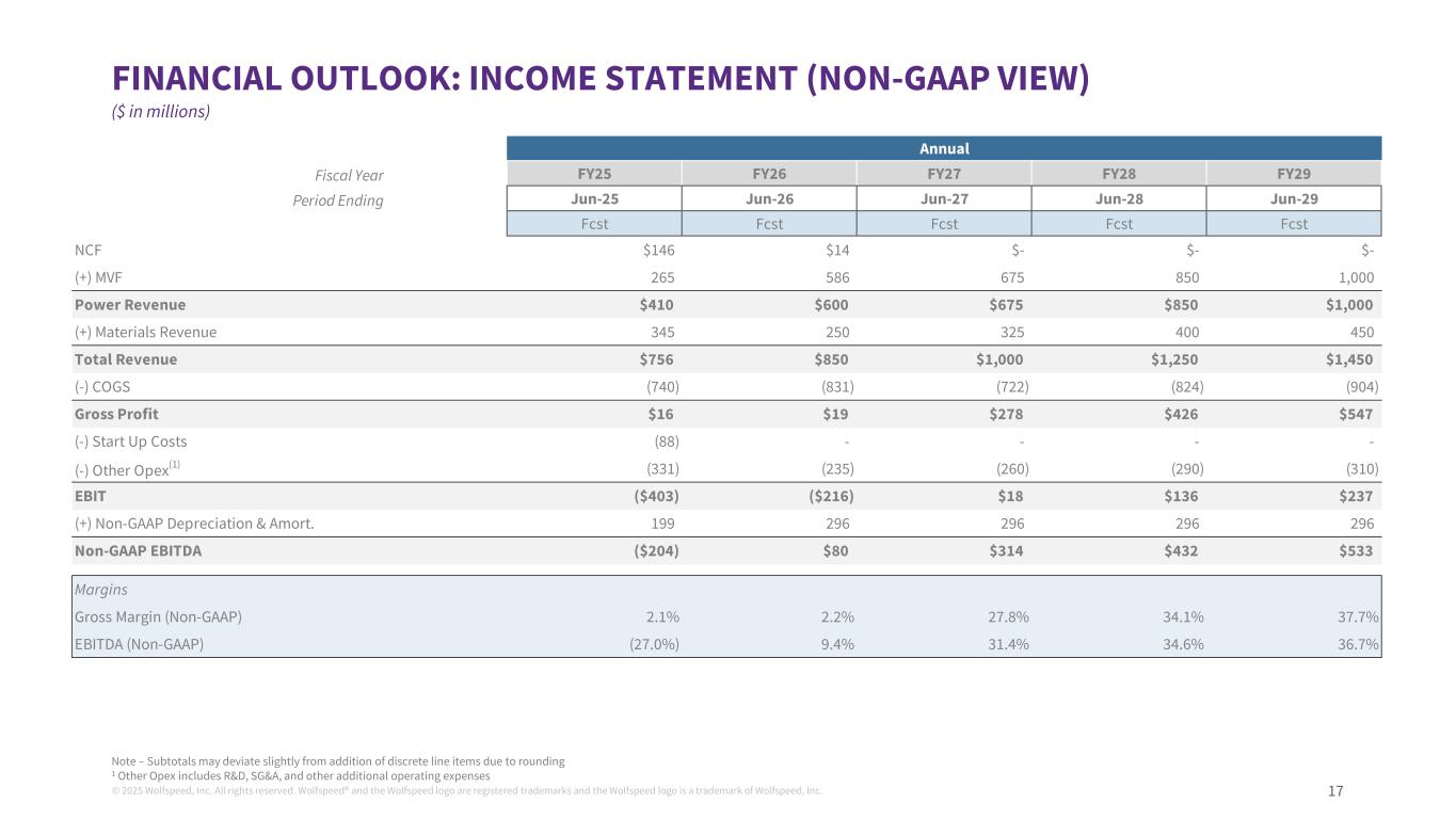 ©2025 Wolfspeed, Inc.版权所有。Wolfspeed®并且Wolfspeed徽标是注册商标,Wolfspeed徽标是Wolfspeed, Inc. 16 WOLFSPEED财务展望-26财年需求前景摘要:-汽车DWINS的斜坡-I & E:复苏迹象–客户升级,渠道库存-材料:150mm需求疲软,重点是增加200mm我们认为,基于26财年目标收入8.5亿美元的财务状况是合适的-25财年末的产能预计将支持1.1B美元的收入毛利率受到MVF/JP装载量的严重影响(25pts摊至现金毛利率),运营行动执行良好:-150mm产能:Farmers Branch关闭(12月),NCF预计将于2H CY25关闭-MVF提前产出-200mm基板成本(350um,Epi转,汽车级)运营支出/支持成本大幅降低:-员工人数下降> 25%,在NCF关闭之前-材料工厂裁员预计现金前景将随着成本行动/运营执行而改善;预计不会产生负债管理质量管理影响-目标无杠杆运营现金流从Q126开始为正-预计支持FY27收入所需的资本支出有限,预计48D激励措施将提供额外支持丨丨丨丨丨丨