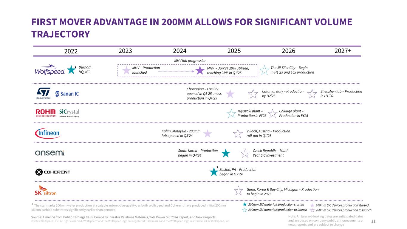 ©2025 Wolfspeed, Inc.版权所有。Wolfspeed®且Wolfspeed标识为注册商标而Wolfspeed标识为Wolfspeed商标,Inc. 10 PURPOSE-BUILT SILICON CABIDE FAB –对成本和毛利率的影响未来功率器件收入在200mm > 50%模具成本降低达勒姆Fab Mohawk Valley Fab Durham Mohawk Valley Diameter 150mm 200mm自动化低全人工成本~40%~10%良率基数*1.25模具成本基数*0.5 Si C POW W er M O SF ETD ie C OS t b y fa b(A t s ca le)Wolfspeed功率器件Fab在> 80%利用率下的比较