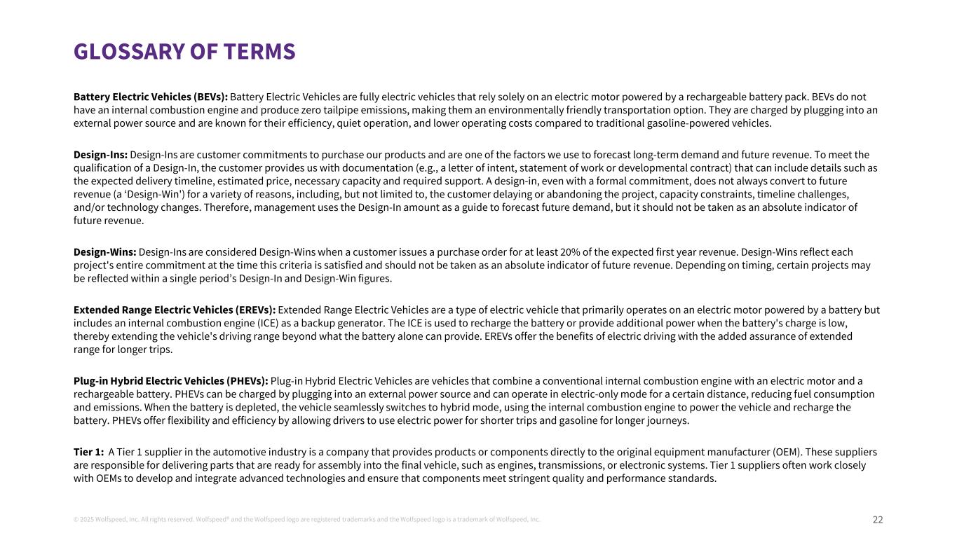©2025 Wolfspeed, Inc.版权所有。Wolfspeed®并且Wolfspeed徽标是注册商标,而Wolfspeed徽标是Wolfspeed, Inc. 22 terms Glossary of Battery Electric Vehicles(BEV)的商标:电池电动汽车是完全依靠由可充电电池组驱动的电动机的全电动汽车。BEV没有内燃机,尾气排放为零,是一种环保的运输选择。与传统的汽油动力汽车相比,它们通过插入外部电源进行充电,以高效、操作安静、运行成本更低而著称。Design-Ins:Design-Ins是客户购买我们产品的承诺,是我们用来预测长期需求和未来收入的因素之一。为满足design-in的资格,客户向我们提供文件(例如意向书、工作说明或开发合同),其中可以包括诸如预期交付时间表、估计价格、必要容量和所需支持等详细信息。一项设计----即使有正式承诺,也并不总是转化为未来收入(‘设计----赢’),原因多种多样,包括但不限于客户推迟或放弃项目、产能限制、时间线挑战和/或技术变化。因此,管理层使用设计金额作为预测未来需求的指南,但不应将其作为未来收入的绝对指标。Design-Wins:当客户发出至少为预期第一年收入的20%的采购订单时,Design-ins被视为Design-Wins。Design-Wins反映了每个项目在满足这一标准时的全部承诺,不应被视为未来收入的绝对指标。根据时间的不同,某些项目可能会反映在单一时期的design-in和design-win数字中。增程电动汽车(EREV):增程电动汽车是一种电动汽车,主要依靠由电池驱动的电动机运行,但包括作为备用发电机的内燃机(ICE)。ICE用于在电池电量较低时为电池充电或提供额外电力,从而将车辆的行驶里程扩大到电池本身所能提供的范围之外。EREV提供了电动驾驶的好处,并为更长的行程增加了续航里程的保证。插电式混合动力汽车(PHEV):插电式混合动力汽车是将传统内燃机与电动机和可充电电池相结合的汽车。PHEV可通过插入外部电源充电,并可在纯电动模式下运行一定距离,减少油耗和排放。当电池耗尽时,车辆无缝切换到混合动力模式,使用内燃机为车辆提供动力并为电池充电。PHEV提供了灵活性和效率,允许驾驶员在较短的行程中使用电力,在较长的行程中使用汽油。Tier1:汽车行业Tier1供应商是直接向原始设备制造商(OEM)提供产品或组件的公司。这些供应商负责交付准备装配到最终车辆中的零部件,例如发动机、变速器或电子系统。一级供应商经常与主机厂密切合作,开发和整合先进技术,并确保组件符合严格的质量和性能标准。