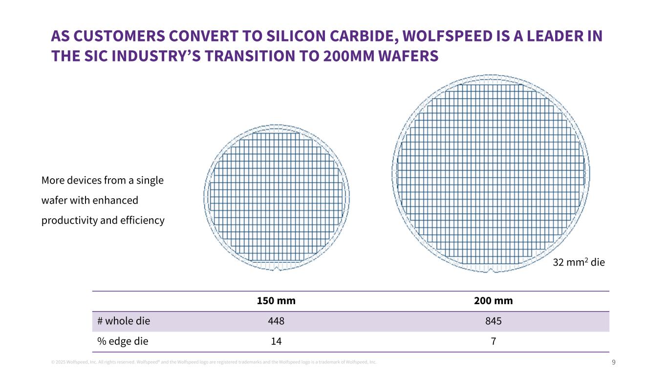 ©2025 Wolfspeed, Inc.版权所有。Wolfspeed®并且Wolfspeed logo是注册商标而Wolfspeed logo是丨Wolfspeed,Inc. Wolfspeed, Inc. 9的商标随着客户向碳化硅的转化,Wolfspeed是SIC行业向200mm晶圆过渡的领导者更多的器件从单晶片提高生产力和效率32 mm2 die 150 mm200 mm #整片die 448845% edge die 147