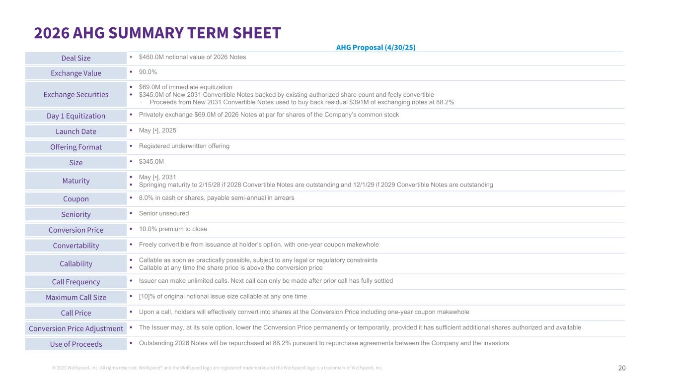 ©2025 Wolfspeed, Inc.版权所有。Wolfspeed®且Wolfspeed标识为注册商标而Wolfspeed标识为Wolfspeed商标,Inc.202026年AHG简要期限表建议(4/30/25)交易规模4.60亿美元2026年票据交换价值90.0%的名义价值交换证券6900万美元的即时权益化3.45亿美元的新2031年可转换票据,由现有授权股份数量支持,可进行有理由的可转换-新的2031年可转换票据的收益用于以88.2%的利率回购剩余的3.91亿美元交换票据第1天证券化以面值非公开交换6900万美元的2026年票据以换取公司普通股发行日期的股份[ • ],2025年发行格式注册承销发行规模3.45亿美元到期5月[ • ],2031年春季到期至2/15/28,如果2028年可转换票据未偿还,12/1/29,如果2029年可转换票据未偿还,则票息为8.0%现金或股票,支付半年一次的拖欠资历高级无抵押转换价格10.0%的溢价,以结束可根据持有人的选择从发行中自由转换的可兑换性,并在实际可行的情况下尽快赎回一年的票息整齐可兑换性,受任何法律或监管限制可随时赎回的股份价格高于转换价格赎回频率发行人可以无限次赎回。只有在先前的认购已全部结算最大认购规模[ 10 ] %的原始名义发行规模可在任何一次赎回价格后,才能进行下一次认购。在一次认购时,持有人将有效地按包括一年票息makeWhole转换价格调整的转换价格转换为股份发行人可自行选择永久或暂时降低转换价格,但前提是其有足够的额外股份授权和可供使用的所得款项未偿还2026年票据将根据公司与投资者之间的回购协议按88.2%回购