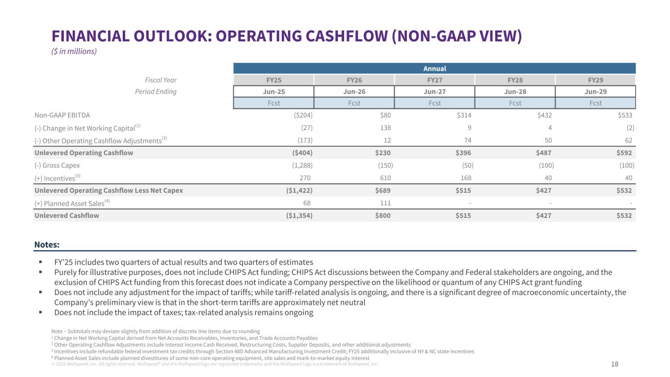 ©2025 Wolfspeed, Inc.版权所有。Wolfspeed®且Wolfspeed标识为注册商标而Wolfspeed标识为Wolfspeed商标,Inc. 17年度财政年度FY25 FY26 FY27 FY28 FY29期间截至6月25日JUN-26 JUN-27 JUN-28 JUN-29 FCST FCST FCST FCST NCF $ 146 $ 14 $-$-$-(+)MVF 265586675850 1,000 Power revenue $ 410 $ 600 $ 675 $ 850 $ 1,000(+)Materials revenue 345250325400450 total revenue $ 756 $ 850 $ 1,000 $ 1,250 $ 1,450(-)COGS(740)(831)(722)(824)(904)gross profit $ 16 $ 19 $ 278 $ 426 $ 547(-)start up costs(88)---(-)其他opex(1199296296296296 Non-GAAP EBITDA($ 204)$ 80 $ 314 $ 432 $ 533利润率(non-GAAP)2.1% 2.2% 27.8% 34.1% 37.7% EBITDA(non-GAAP)(27.0%)9.4% 31.4% 34.6% 36.7%财务展望:损益表(NON-GAAP VIEW)(百万美元)注–由于四舍五入,小计可能略有偏离添加的离散行项目1其他运营支出包括研发、SG & A和其他额外运营费用