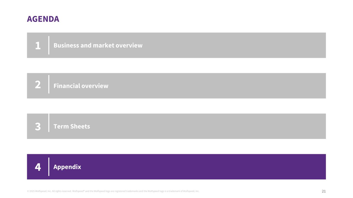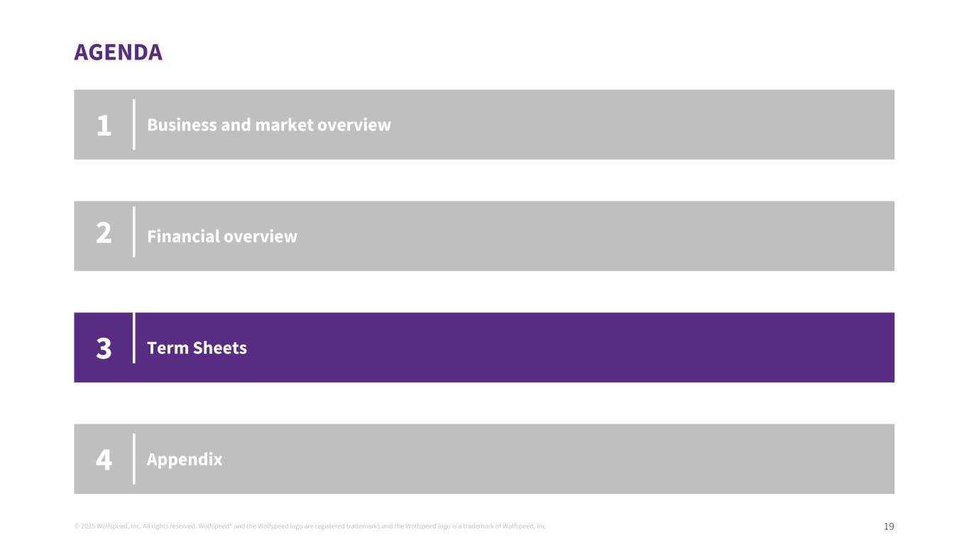 ©2025 Wolfspeed, Inc.版权所有。Wolfspeed®并且Wolfspeed徽标为注册商标,Wolfspeed徽标为Wolfspeed, Inc.的商标19议程业务和市场概览财务概览条款清单123附录4
