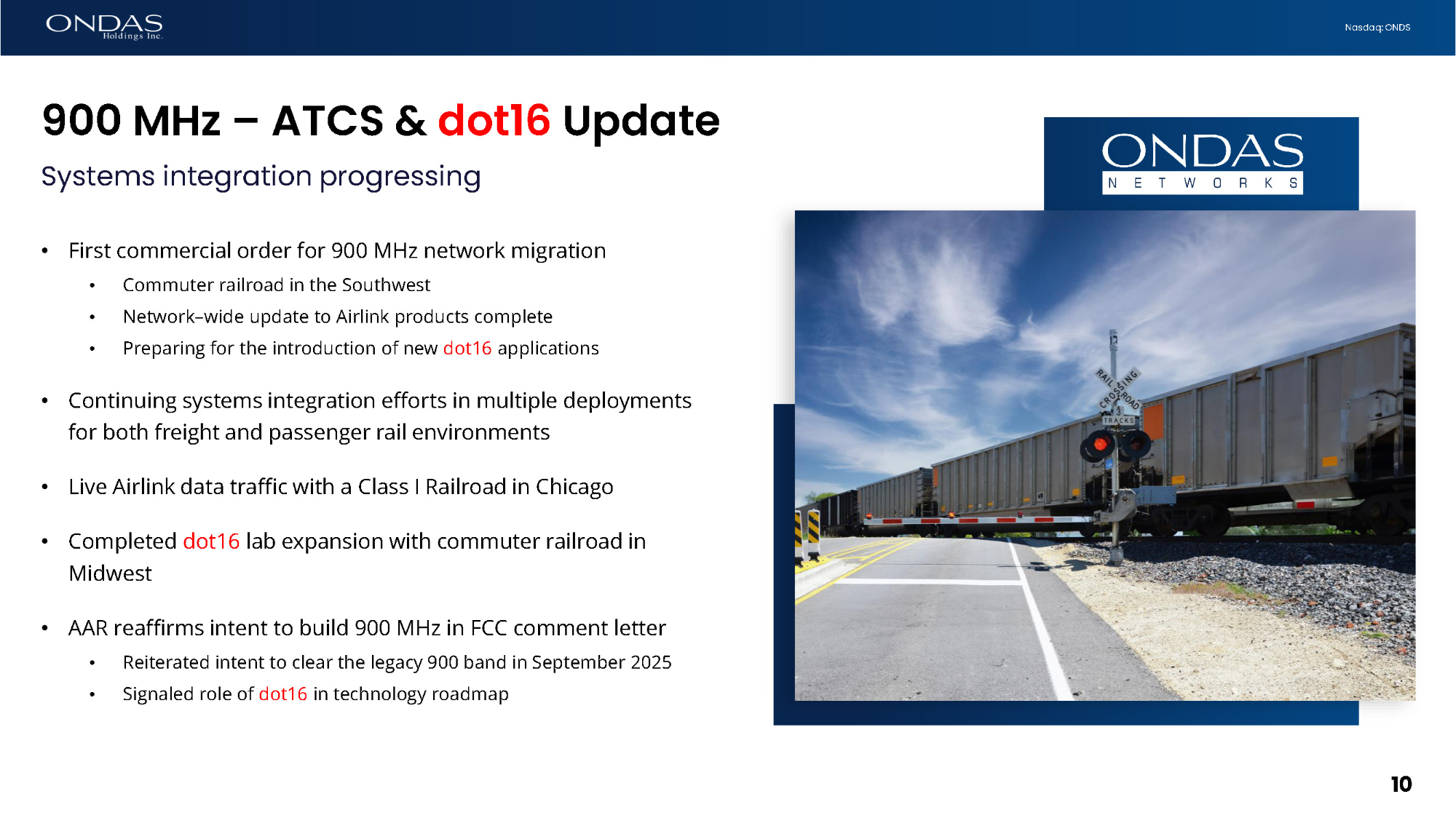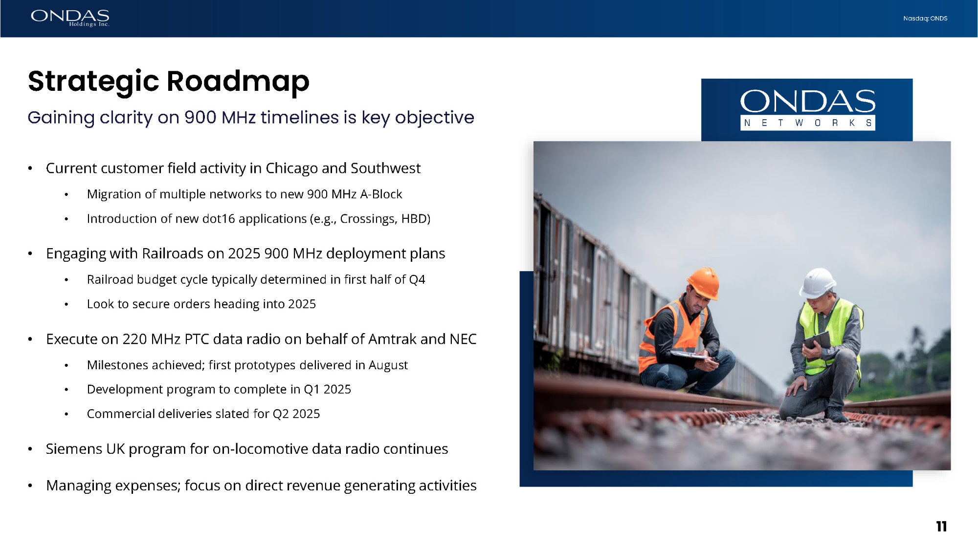 纳斯达克:ONDS str6tegic ro6dm6p 11在900MHz时间线上获得清晰度是关键目标•目前芝加哥和西南地区的客户现场活动•多个网络迁移到新的900MHz A-Block •引入新的dot16应用程序(例如,交叉,HBD)•与铁路公司就2025年900MHz部署计划进行接触•铁路预算周期通常在第四季度上半年确定•期待确保进入2025年的订单•代表Amtrak和NEC在220MHz PTC数据无线电上执行•实现了里程碑;首批原型于8月交付•开发计划将于2025年第一季度完成•定于2025年第二季度的商业交付•西门子英国的机车上数据无线电计划继续进行•管理费用;专注于直接创收活动