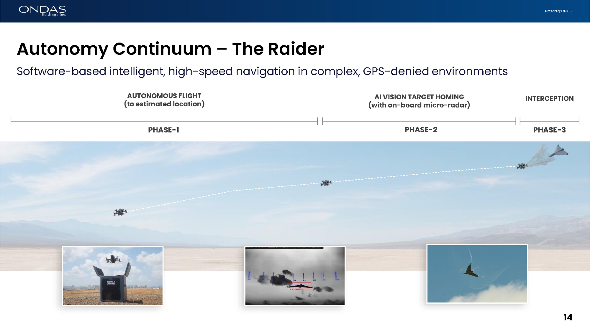 纳斯达克:ONDS autofiomy cofitifiuum –基于R6ider软件的智能、高速导航,在复杂、拒绝GPS的环境中自动飞行(到估计位置)AI视觉目标归位(带板上微型雷达)阶段-1阶段-3拦截阶段-2 14