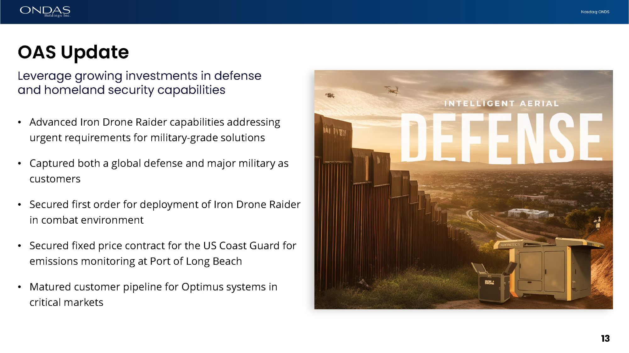 纳斯达克:ONDS OAS Upd6te 13利用对国防和国土安全能力不断增长的投资•先进的铁无人机Raider能力可满足对军事级解决方案的迫切需求•既抓住了全球防务又抓住了主要军队作为客户•获得了在作战环境中部署铁无人机Raider的首个订单•获得了美国海岸警卫队在长滩港排放监测的固定价格合同•在关键市场上成熟的Optimus系统客户管道