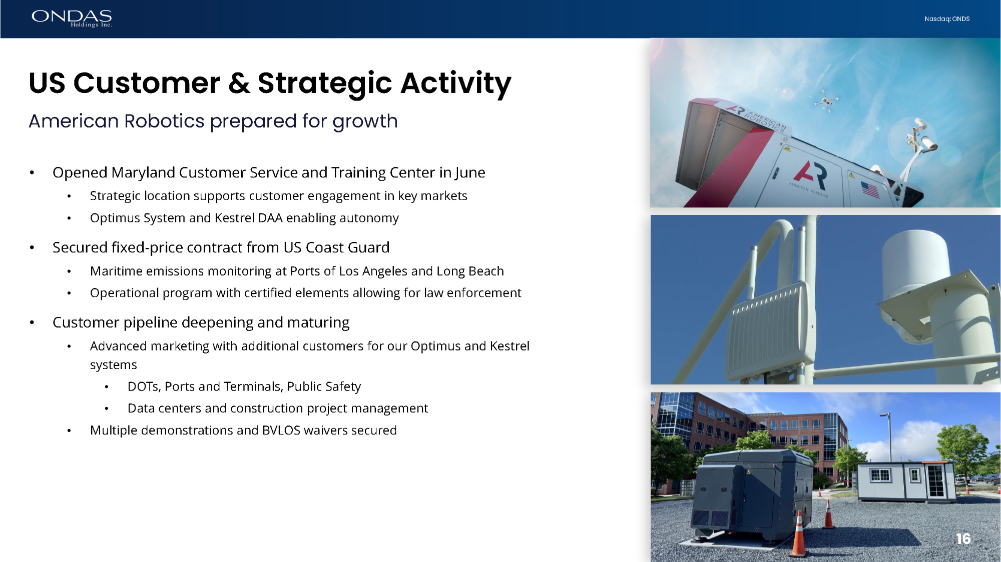 纳斯达克:ONDS美国客户& str6tegic活动1516美国机器人公司为增长做好准备• 6月开设马里兰州客户服务和培训中心•战略位置支持关键市场的客户参与• Optimus System和Kestrel DAA支持自主性•获得美国海岸警卫队的固定价格合同•洛杉矶和长滩港口的海上排放监测•带有允许执法的认证元素的运营计划•客户管道不断深化和成熟•为我们的Optimus和Kestrel系统与更多客户进行高级营销• DOT、港口和码头,公共安全•数据中心和建设项目管理•获得多个示范和BVLOS豁免