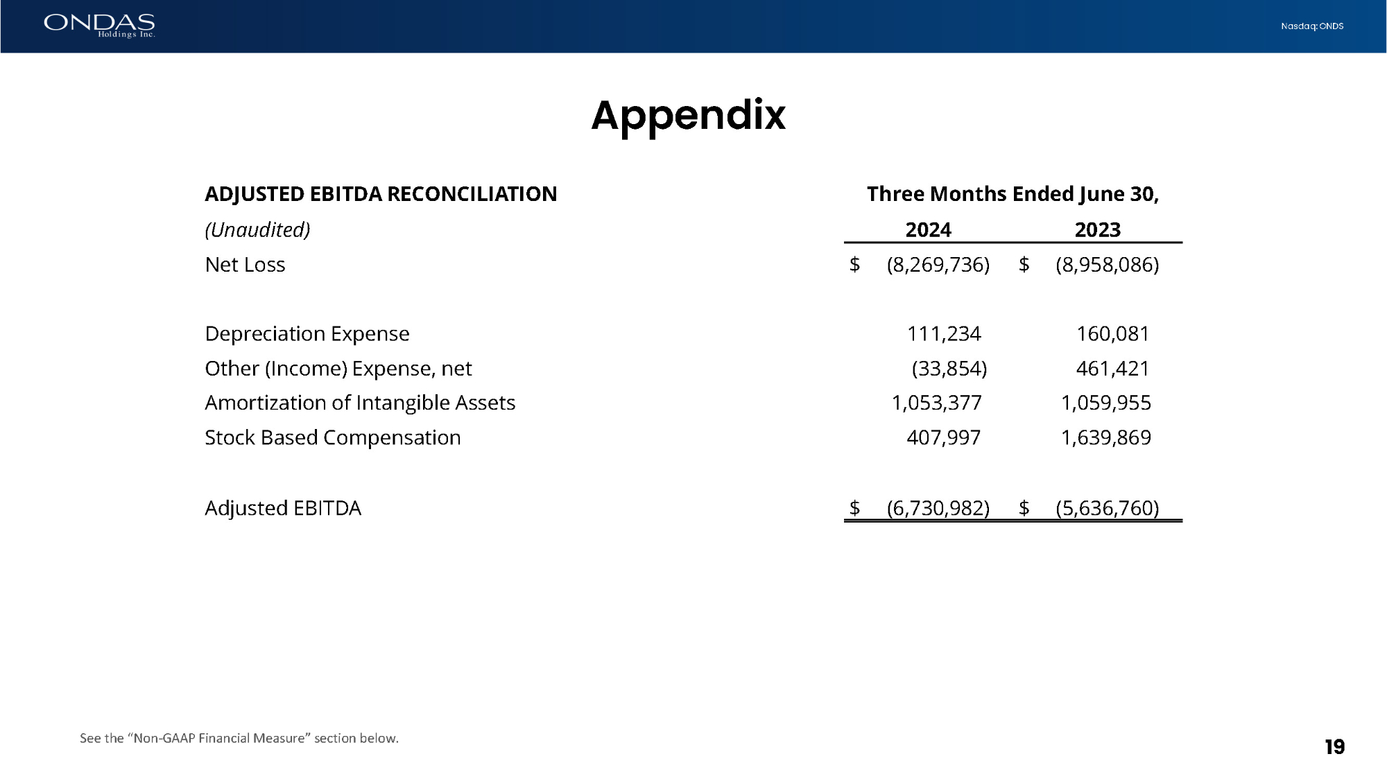 19日纳斯达克:ONDS见下文“Non-GAAP财务指标”部分。附录截至6月30日止三个月经调整EBITDA对账20232024(未经审计)$(8,958,086)$(8,269,736)净亏损160,081111,234折旧费用461,421(33,854)其他(收入)费用净额1,059,9551,053,377无形资产摊销1,639,869407,997基于股票的补偿$(5,636,760)$(6,730,982)经调整EBITDA