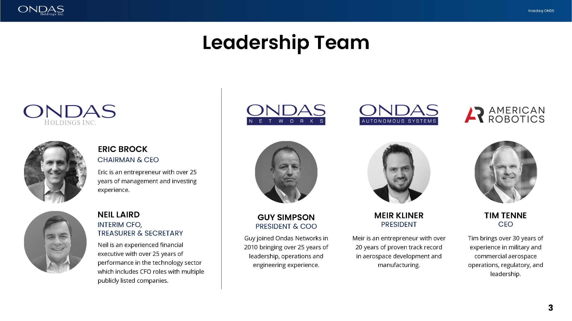 纳斯达克:ONDS此演示文稿可能包含根据1995年《私人证券诉讼改革法案》(PSLRA)定义的“前瞻性陈述”,该术语可通过“预期”、“项目”、“将”、“可能”、“预期”、“相信”、“应该”、“打算”、“估计”和其他类似含义的词语来识别这些陈述。Ondas Holdings Inc.(“Ondas”或“公司”)提醒读者,前瞻性陈述是基于其目前对未来事件的预期做出的预测。这些前瞻性陈述不是对未来业绩的保证,并受到难以预测的风险、不确定性和假设的影响。由于多种因素,公司的实际业绩、业绩或成就可能与前瞻性陈述中明示或暗示的存在重大差异,包括公司最近向美国证券交易委员会(“SEC”)提交的10-K表格年度报告中“风险因素”标题下讨论的风险,在公司向SEC提交的10-Q表格季度报告中,以及公司向SEC提交的其他文件。公司不承担公开更新或修改任何前瞻性陈述的义务,无论是由于新信息、未来事件或该日期之后发生的其他情况,除非法律要求。此外,本演示文稿还包含一项非GAAP财务指标。有关这一非GAAP财务指标的描述,包括与GAAP下最具可比性的指标的对账,请参阅本演示文稿的附录。本演示文稿中的信息不是出售证券的要约或购买证券的要约邀请,也不应在根据该司法管辖区的证券法进行注册或获得资格之前此类要约、邀请或出售将是非法的任何司法管辖区出售证券。2 Discl6imer