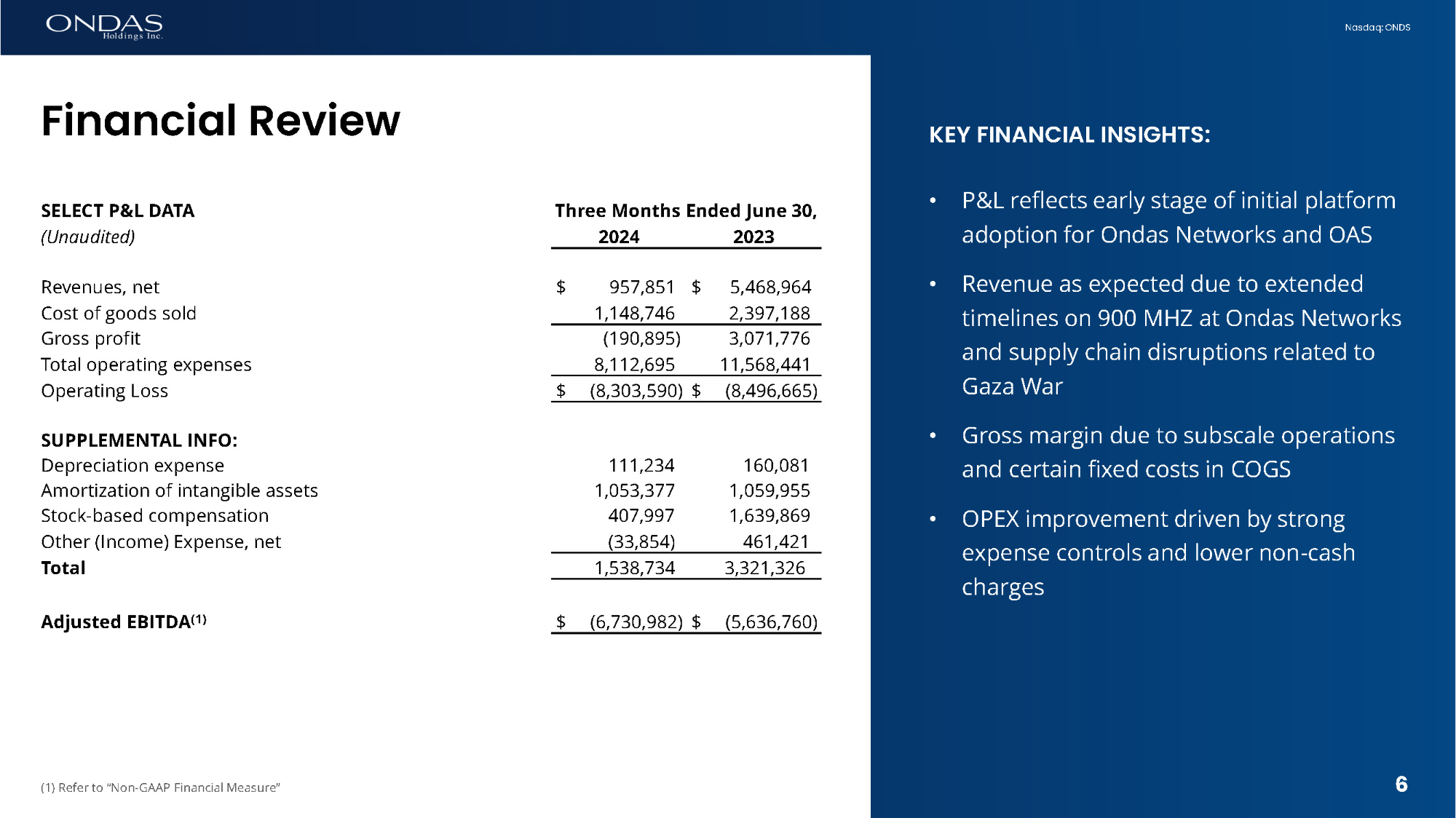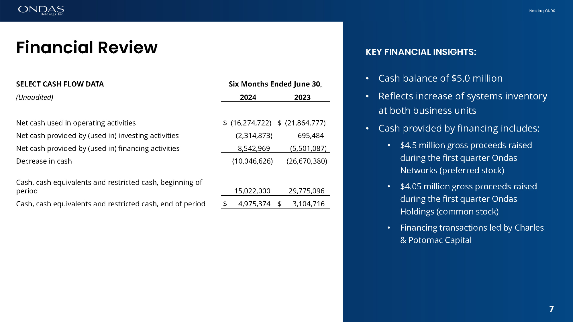 6 纳斯达克:ONDS主要财务洞察:•损益反映Ondas Networks和OAS初步采用平台的早期阶段•由于Ondas Networks的900MHZ时间延长以及与加沙战争相关的供应链中断,收入符合预期•次规模运营和COGS中的某些固定成本导致毛利率•由强有力的费用控制和较低的非现金费用推动的运营支出改善(1)参考“非公认会计准则财务指标”FIFi6fici6l Review 6截至6月30日的三个月,Select P & L DATA 20232024(未经审计)5,468,964美元957,851美元收入,净额2,397,1881,148,746销货成本3,071,776(190,895)毛利11,568,4418,112,695营业费用总额$(8,496,665)$(8,303,590)营业亏损补充信息:160,081111,234折旧费用1,059,9551,053,377无形资产摊销1,639,869407,997股票补偿461,421(33,854)其他(收入)费用净额3,321,3261,538,734合计$(5,636,760)$(6,730,982)调整后EBITDA(1)