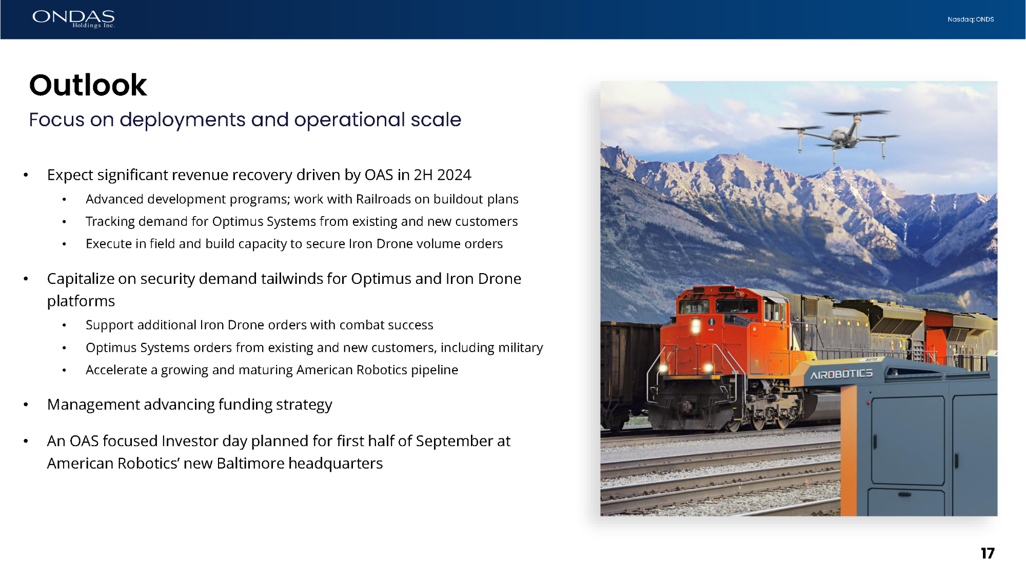 纳斯达克:ONDS •预计2024年下半年OAS将推动收入显着复苏•高级开发计划;与Railroads合作制定扩建计划•跟踪现有客户和新客户对Optimus系统的需求•在现场执行并进行能力建设,以确保铁无人机批量订单•利用Optimus和铁无人机平台的安全需求顺风•支持额外的铁无人机订单并取得战斗成功• Optimus Systems现有客户和新客户的订单,包括军事•加速不断增长和成熟的美国机器人管道•管理层推进筹资战略•计划于9月上半月在American Robotics新的巴尔的摩总部举办以OAS为重点的投资者日展望重点关注部署和运营规模17