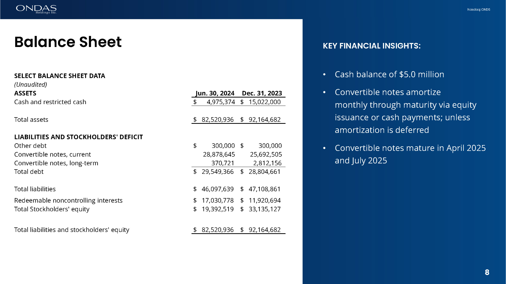纳斯达克:ONDS主要财务洞察:78 •现金余额500万美元•对Ondas Holdings和Ondas Networks的新投资•可转换票据通过发行股票或现金支付的方式通过到期按月摊销;除非摊销递延•可转换票据于2025年4月和2025年7月到期B6l6fice表选择资产负债表数据(未经审计)2023年12月31日2024年6月30日资产15,022,000美元4,975,374美元现金和受限现金92,164,682美元82,520,936总资产负债和股东赤字300,000美元300,000美元其他债务25,692,50528,878,645可转换票据,当前2,812,156370,721可转换票据长期$ 28,804,661 $ 29,549,366总债务$ 47,108,861 $ 46,097,639总负债$ 11,920,694 $ 17,030,778可赎回非控制性权益$ 33,135,127 $ 19,392,519总股东权益$ 92,164,682 $ 82,520,936总负债和股东权益