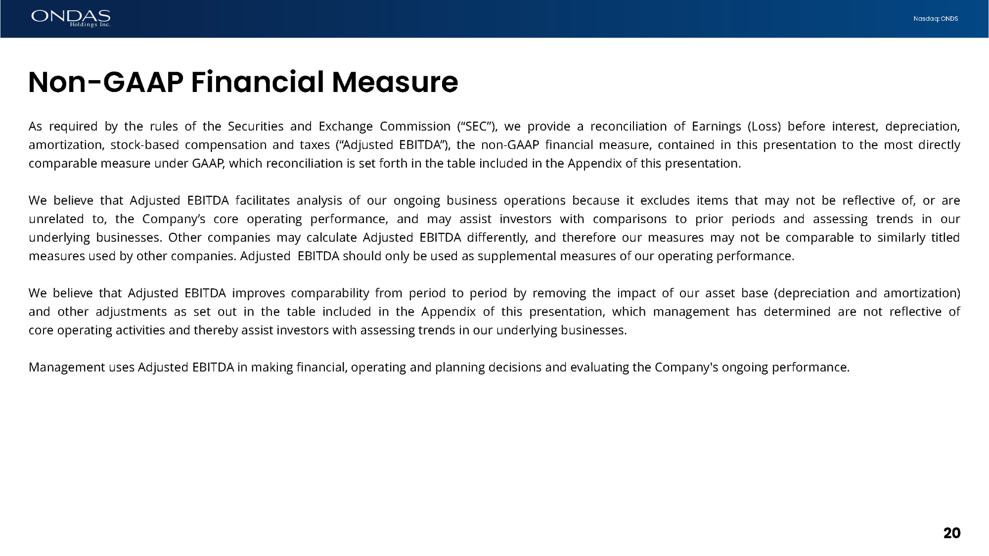 20 纳斯达克:ONDS根据美国证券交易委员会(“SEC”)规则的要求,我们提供了本演示文稿中包含的利息、折旧、摊销、股票补偿和税项前利润(亏损)(“调整后EBITDA”)与GAAP下最直接可比的衡量标准的对账,该对账在本演示文稿附录中的表格中列出。我们认为,调整后的EBITDA有助于分析我们正在进行的业务运营,因为它排除了可能无法反映公司核心经营业绩或与其无关的项目,并可能有助于投资者与前期进行比较并评估我们基础业务的趋势。其他公司可能会以不同的方式计算调整后EBITDA,因此我们的衡量标准可能无法与其他公司使用的类似标题的衡量标准进行比较。调整后的EBITDA只能作为我们经营业绩的补充衡量标准。我们认为,调整后的EBITDA通过去除我们的资产基础(折旧和摊销)以及本演示文稿附录中表格中所列的其他调整的影响,提高了不同时期的可比性,管理层已确定这些调整不反映核心经营活动,从而帮助投资者评估我们基础业务的趋势。管理层使用调整后的EBITDA来做出财务、运营和规划决策,并评估公司的持续业绩。诺菲-GAAP FIFi6fici6l Me6sure