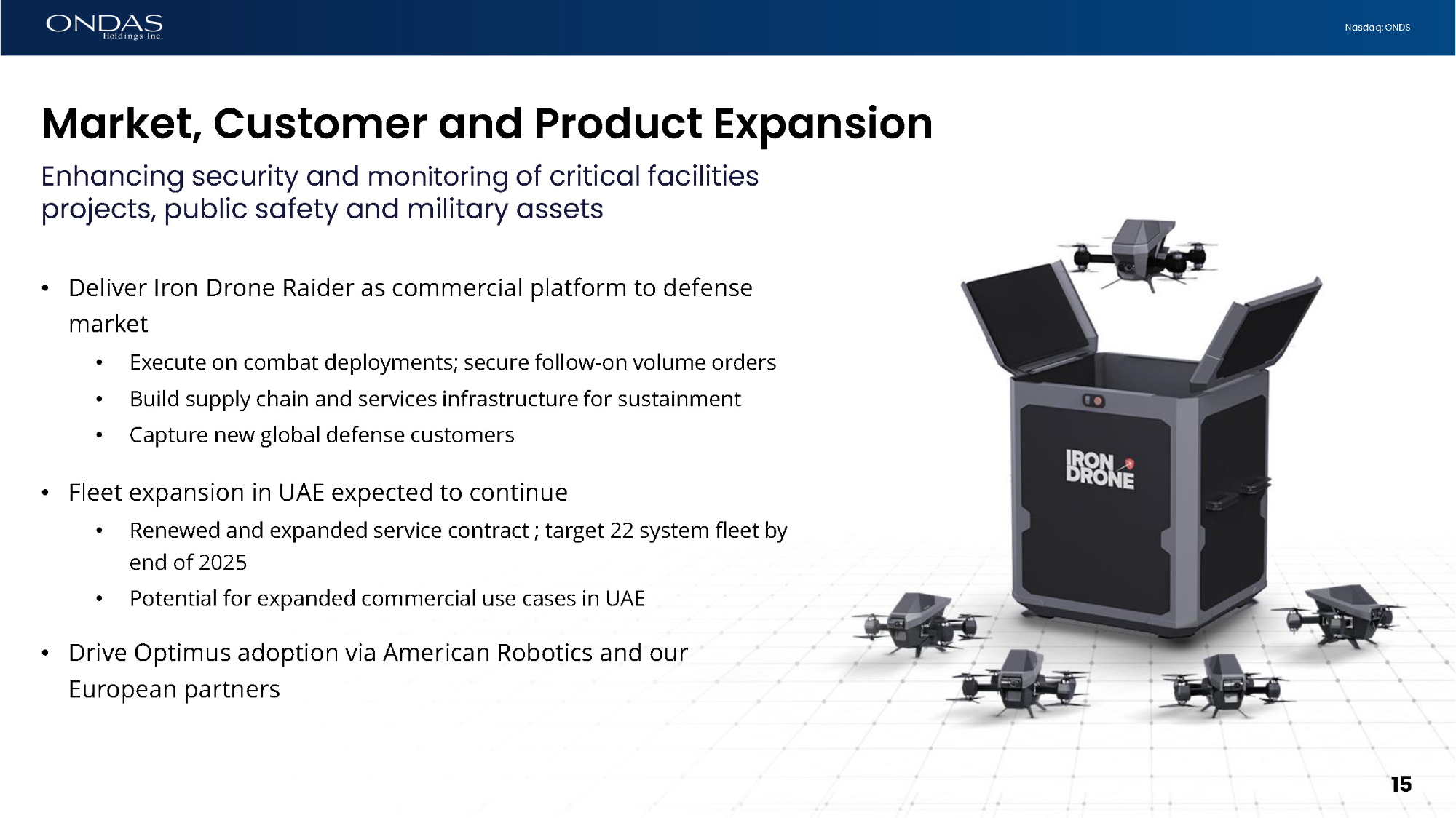 纳斯达克:ONDS M6rket、客户6fid产品exp6fisiofi 1515加强关键设施项目的安全性和监控,公共安全和军事资产•将Iron Drone Raider作为商业平台交付国防市场•执行作战部署;确保后续批量订单•为维持建立供应链和服务基础设施•捕获新的全球国防客户•预计将继续在阿联酋进行机队扩张•更新和扩大服务合同;到2025年底目标22系统机队•在阿联酋扩大商业用例的潜力•通过美国机器人技术和我们的欧洲合作伙伴推动Optimus的采用