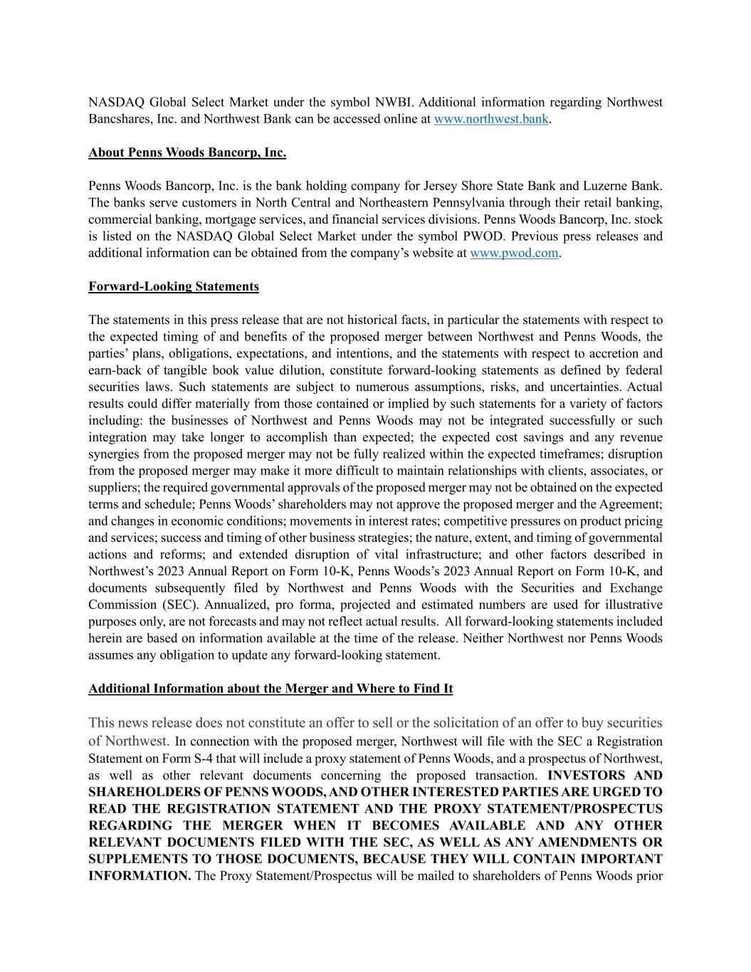 纳斯达克全球精选市场,代码为NWBI。有关西北银行和西北银行的更多信息,请访问www.northwest.bank在线访问。关于Penns Woods Bancorp, Inc.彭斯-伍茨银行是泽西海岸州立银行和卢泽恩银行的银行控股公司。这些银行通过其零售银行、商业银行、抵押贷款服务和金融服务部门为宾夕法尼亚州中北部和东北部的客户提供服务。彭斯-伍茨银行,Inc.股票在纳斯达克全球精选市场上市,代码为PWOD。以前的新闻稿和其他信息可从公司网站www.pwod.com获得。前瞻性陈述本新闻稿中非历史事实的陈述,特别是关于Northwest与Penns Woods拟议合并的预期时间和收益的陈述,双方的计划、义务、期望和意图,以及关于有形账面价值稀释的增值和收益的陈述,构成联邦证券法定义的前瞻性陈述。此类陈述受到众多假设、风险和不确定性的影响。由于多种因素,实际结果可能与此类声明中包含或暗示的结果存在重大差异,包括:Northwest和Penns Woods的业务可能无法成功整合,或者此类整合可能需要比预期更长的时间才能完成;拟议合并带来的预期成本节约和任何收入协同效应可能无法在预期时间范围内完全实现;拟议合并造成的中断可能会使与客户、联营公司保持关系变得更加困难,或供应商;可能无法按预期条款和时间表获得拟议合并所需的政府批准;Penns Woods的股东可能不会批准拟议合并和协议;以及经济状况的变化;利率变动;产品定价和服务的竞争压力;其他商业战略的成功和时机;政府行动和改革的性质、程度和时间;以及对重要基础设施的长期破坏;以及西北航空2023年度报告10-K表格、Penns Woods 2023年度报告10-K表格中描述的其他因素,以及随后由Northwest和Penns Woods向美国证券交易委员会(SEC)提交的文件。年化、备考、预测和估计数字仅用于说明目的,并非预测,可能无法反映实际结果。本文中包含的所有前瞻性陈述均基于发布时可获得的信息。Northwest和Penns Woods均不承担更新任何前瞻性陈述的义务。有关合并的附加信息和在哪里可以找到它本新闻稿不构成出售要约或购买西北证券的要约邀请。关于拟议的合并,Northwest将向SEC提交S-4表格的注册声明,其中将包括Penns Woods的代理声明、Northwest的招股说明书,以及与拟议交易有关的其他相关文件。请PENS Woods的投资者和股东以及其他相关方在合并可用时阅读注册声明和有关合并的代理声明/招股说明书以及向SEC提交的任何其他相关文件,以及对这些文件的任何修订或补充,因为它们将包含重要信息。委托书/招股说明书将提前邮寄给Penns Woods的股东