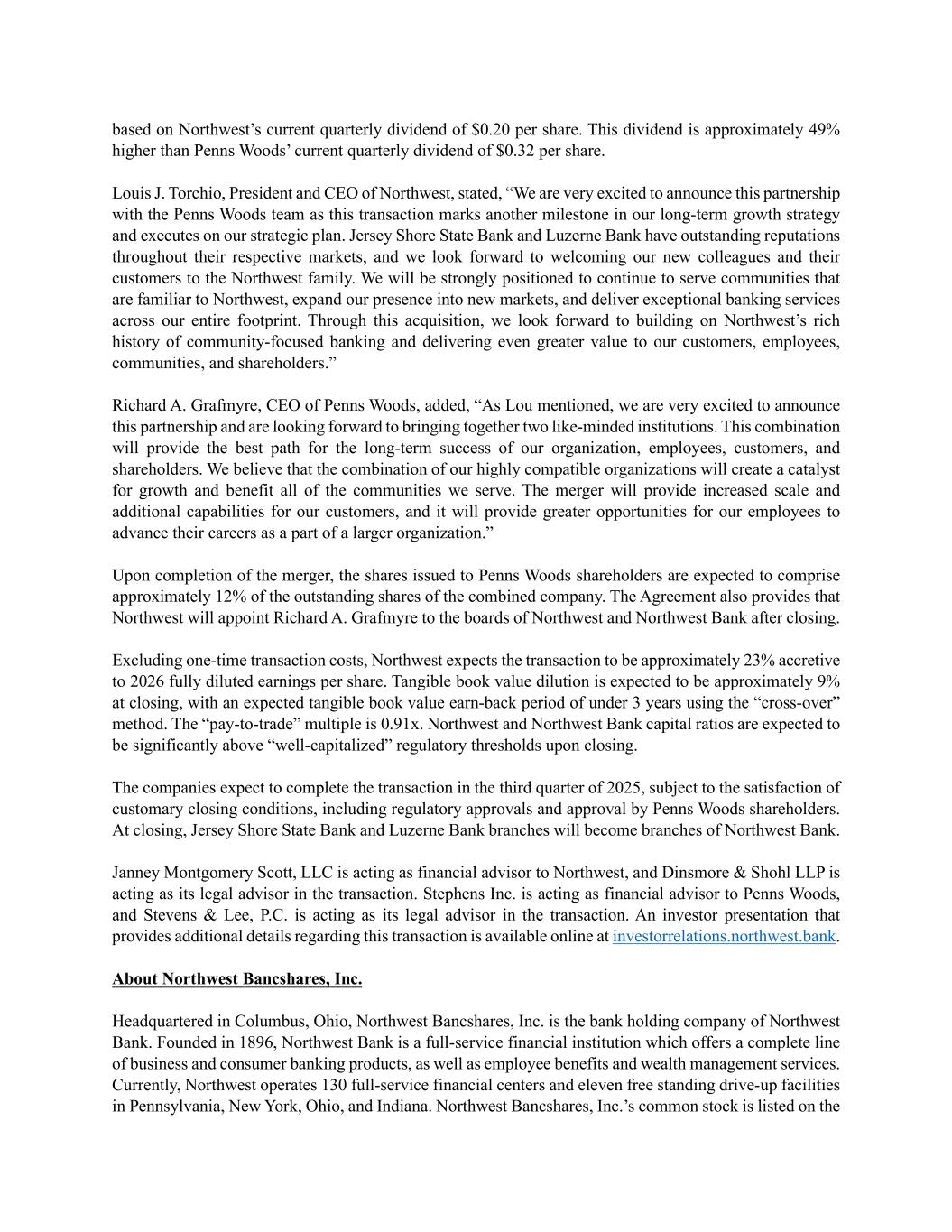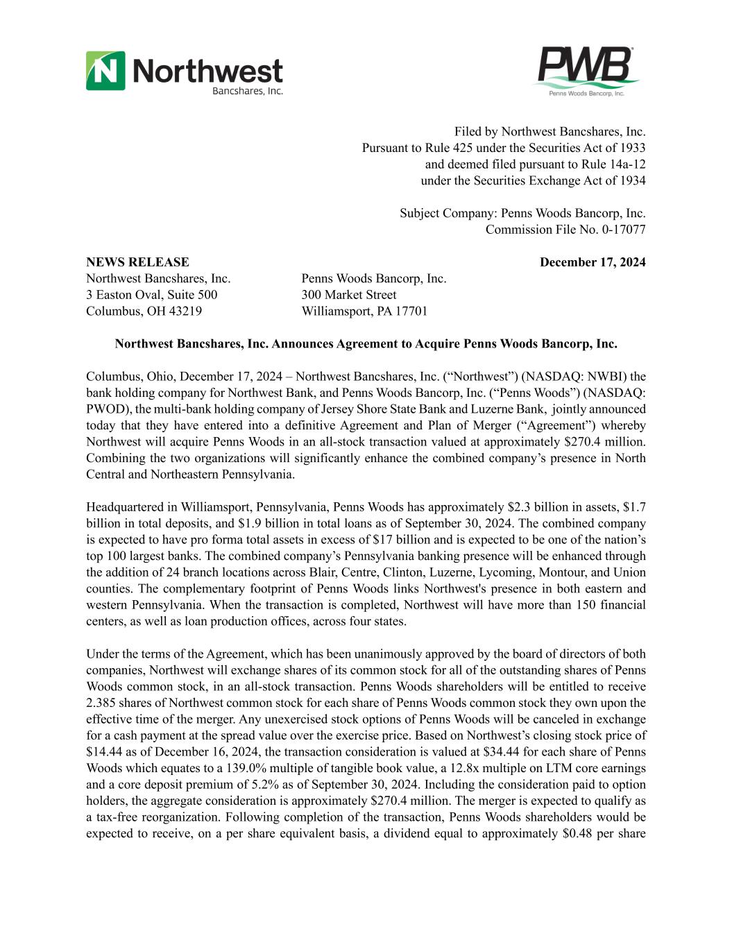 由Northwest Bancshares, Inc.根据1933年《证券法》第425条提交,并被视为根据1934年《证券交易法》第14a-12条提交的标的公司:Penns Woods Bancorp, Inc.委员会文件编号0-17077 NEWS release 2024年12月17日丨Northwest Bancshares,Inc. Northwest Bancshares, Inc.Penns Woods Bancorp, Inc.TERM3 Easton Oval,Suite 500300 Market Street Columbus,OH 43219 Williamsport,PA 17701 Northwest Bancshares, Inc.宣布同意收购TERM0 Woods Bancorp,Inc. Penns Woods Bancorp, Inc. Columbus,Ohio,December 17,2024 –丨Northwest Bancshares,Inc. Northwest Bancshares, Inc.(“Northwest”)(NASDAQ:丨新世界银行股份有限公司)(NASDAQ:丨新世界银行)Jersey Shore State Bank和Luzerne Bank旗下多银行控股公司Inc.(“Penns Woods”)(NASDAQ:PWOD)今天联合宣布,双方已达成一项最终协议和合并计划(“协议”),据此,Northwest将以价值约2.704亿美元的全股票交易收购Penns Woods。合并这两个组织将显着增强合并后公司在宾夕法尼亚州中北部和东北部的影响力。Penns Woods总部位于宾夕法尼亚州威廉斯波特,截至2024年9月30日,公司资产约为23亿美元,存款总额为17亿美元,贷款总额为19亿美元。合并后的公司预计将拥有超过170亿美元的备考总资产,并有望成为美国最大的100家银行之一。合并后的公司在宾夕法尼亚州的银行业务将通过在布莱尔、森特、克林顿、卢塞恩、莱康明、蒙图尔和联盟各县增加24个分支机构而得到加强。Penns Woods的互补足迹将西北航空在宾夕法尼亚州东部和西部的存在联系起来。交易完成后,西北银行将在四个州拥有150多个金融中心,以及贷款生产办公室。根据已获得两家公司董事会一致批准的协议条款,Northwest将以全股票交易方式将其普通股股份交换为Penns Woods普通股的所有已发行股份。Penns Woods股东将有权在合并生效时获得每股Penns Woods普通股2.385股西北普通股。Penns Woods的任何未被行使的股票期权将被注销,以换取以高于行权价的价差值支付的现金。根据Northwest截至2024年12月16日的收盘价14.44美元计算,每股Penns Woods股票的交易对价为34.44美元,相当于有形账面价值的139.0%倍数,LTM核心收益的12.8倍倍数,以及截至2024年9月30日的核心存款溢价5.2%。包括支付给期权持有人的对价在内,总对价约为2.704亿美元。预计此次合并将符合免税重组的条件。交易完成后,Penns Woods的股东将有望在每股等值的基础上获得相当于每股约0.48美元的股息