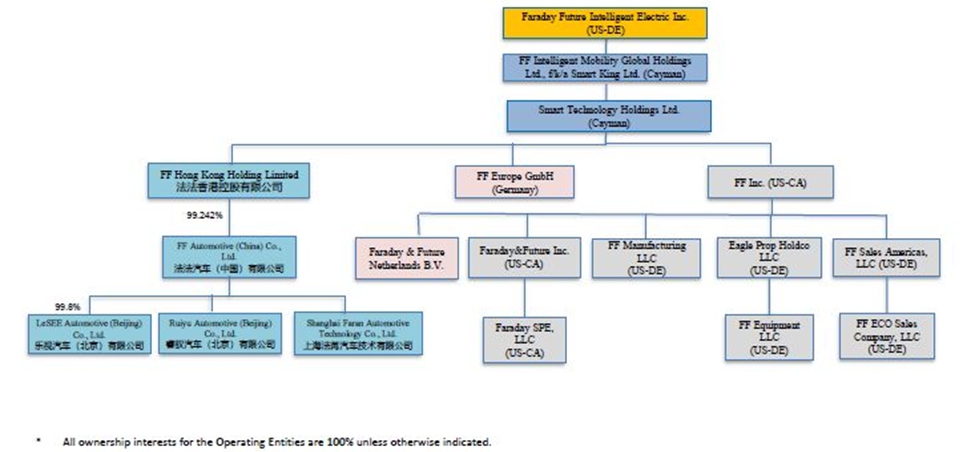 除非文意另有所指,否则本招股说明书中提及“FFIE”指的是Faraday Future Intelligent Electric Inc.(f/k/a Property Solutions Acquisition Corp.),一家在特拉华州注册成立的控股公司,而不是其子公司,而此处提及的“公司”、“FF”、“我们”、“我们”、“我们的”及类似词语指的是FFIE及其合并子公司。我们将我们在美国的主要运营子公司Faraday & Future Inc.称为“FF U.S。”我们将我们在中国(包括香港)组建的所有子公司统称为“中国子公司”,其完整列表载于本招募说明书所包含的注册声明的附件 21.1。提及“PSAC”是指Property Solutions Acquisition Corp.,一家特拉华州公司,我们在业务合并(定义见本文)完成之前的前身公司,而“Legacy FF”是指FF Intelligent Mobility Global Holdings Ltd.,一家根据开曼群岛法律注册成立的豁免有限责任公司,连同其合并子公司,在业务合并(定义见本文)之前。