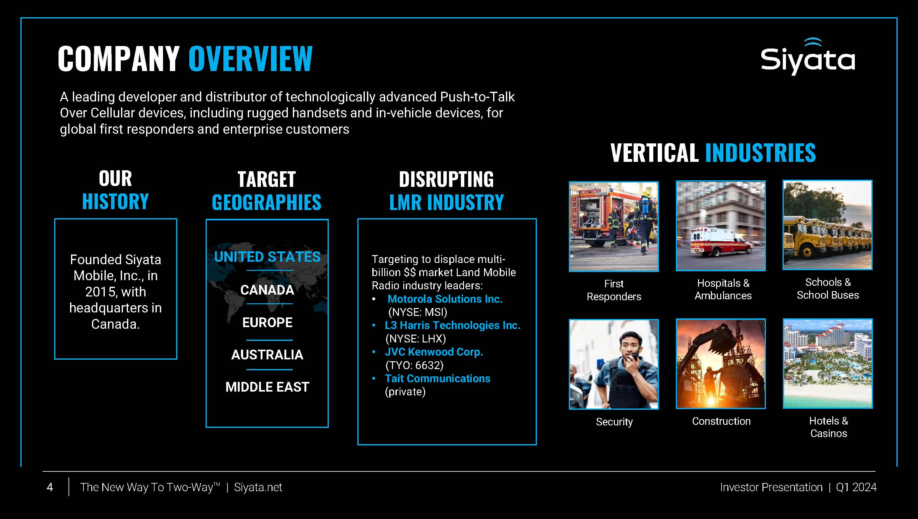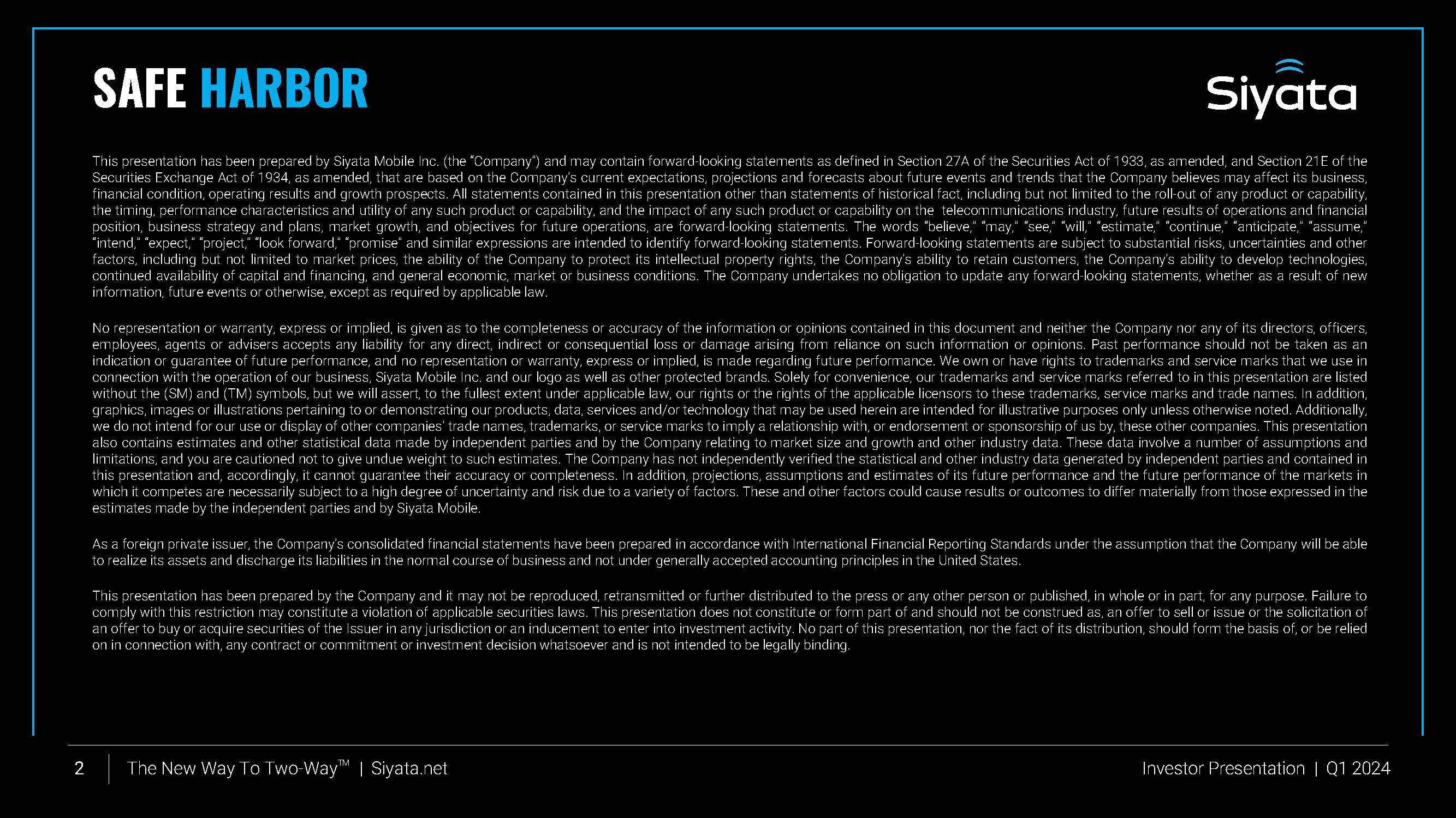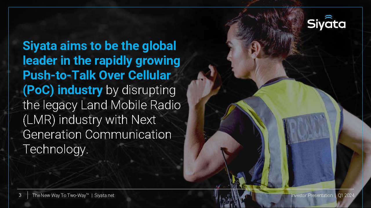 SAFE HARBOR本演示文稿由Siyata Mobile Inc.(“公司”)编制,可能包含经修订的1933年证券法第27A条和经修订的1934年证券交易法第21E条定义的前瞻性陈述,这些陈述基于公司当前对公司认为可能影响其业务、财务状况、经营业绩和增长前景的未来事件和趋势的预期、预测和预测。除历史事实陈述外,本演示文稿中包含的所有陈述,包括但不限于任何产品或能力的推出、任何此类产品或能力的时机、性能特征和效用,以及任何此类产品或能力对电信行业、未来运营结果和财务状况、业务战略和计划、市场增长以及未来运营目标的影响,均为前瞻性陈述。“相信”、“可能”、“看到”、“将”、“估计”、“继续”、“预期”、“假设”、“打算”、“预期”、“项目”、“展望”、“承诺”等类似表述旨在识别前瞻性陈述。前瞻性陈述受到重大风险、不确定性和其他因素的影响,包括但不限于市场价格、公司保护其知识产权的能力、公司留住客户的能力、公司开发技术的能力、资本和融资的持续可用性以及总体经济、市场或商业状况。公司不承担更新任何前瞻性陈述的义务,无论是由于新信息、未来事件或其他原因,除非适用法律要求。对本文件所载信息或意见的完整性或准确性不作任何明示或暗示的陈述或保证,公司或其任何董事、高级职员、雇员、代理人或顾问均不对因依赖此类信息或意见而引起的任何直接、间接或后果性损失或损害承担任何责任。过去的业绩不应被视为未来业绩的指示或保证,也不对未来业绩作出任何明示或暗示的陈述或保证。我们拥有或拥有我们在经营业务时使用的商标和服务标志、Siyata Mobile Inc.和我们的徽标以及其他受保护品牌的权利。仅为方便起见,本演示文稿中提及的我们的商标和服务标记没有(SM)和(TM)符号,但我们将根据适用法律在最大程度上主张我们的权利或适用许可人对这些商标、服务标记和商品名称的权利。此外,除非另有说明,与或演示我们可能在此使用的产品、数据、服务和/或技术有关的图形、图像或插图仅用于说明目的。此外,我们不打算为我们使用或展示其他公司的商号、商标或服务标记而暗示与这些其他公司的关系,或由这些公司为我们背书或赞助。本演示文稿还包含独立方和公司做出的与市场规模和增长相关的估计和其他统计数据以及其他行业数据。这些数据涉及许多假设和限制,请注意不要对这些估计给予不应有的权重。本公司未对独立各方产生并包含在本演示文稿中的统计数据和其他行业数据进行独立验证,因此无法保证其准确性或完整性。此外,对其未来业绩的预测、假设和估计以及其所竞争市场的未来业绩必然受到多种因素的高度不确定性和风险的影响。这些因素和其他因素可能导致结果或结果与独立方和Siyata Mobile作出的估计中表达的结果或结果存在重大差异。作为一家外国私人发行人,公司的合并财务报表是根据国际财务报告准则编制的,假设公司将能够在正常业务过程中变现其资产并清偿其负债,而不是根据美国公认会计原则。本演示文稿由本公司编制,不得为任何目的复制、转发或进一步分发给新闻界或任何其他人士或全部或部分出版。不遵守这一限制可能构成违反适用的证券法。本演示文稿不构成或构成,也不应被解释为, 在任何司法管辖区出售或发行的要约或征求购买或收购发行人证券的要约或进行投资活动的诱因。本演示文稿的任何部分,或其分配的事实,均不应构成任何合同或承诺或投资决定的基础,或与之相关而被依赖,且无意具有法律约束力。2新的双向方式TM | SIYATA.Net投资者说明会| 2024年第一季度