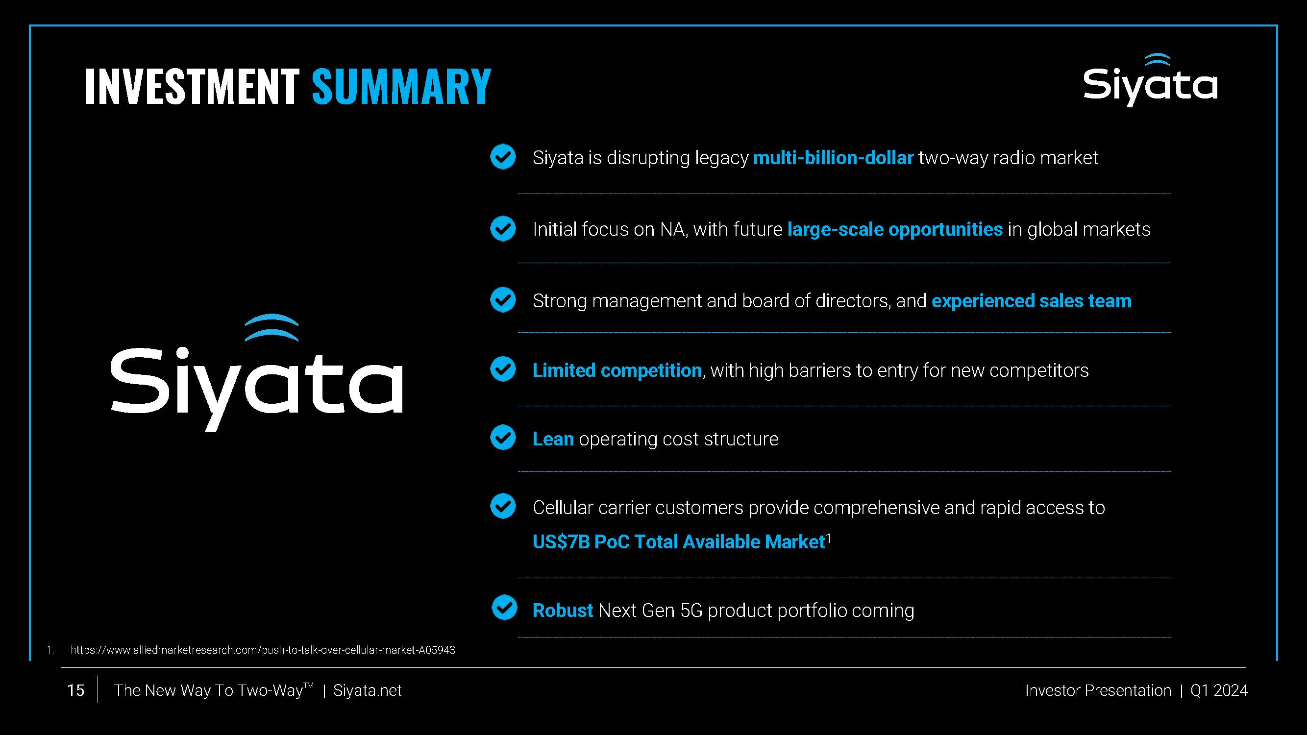 Siyata正在颠覆传统的数十亿美元双向无线电市场最初专注于NA,未来在全球市场的大规模机会强大的管理层和董事会,经验丰富的销售团队有限的竞争,新竞争对手进入壁垒高精益运营成本结构蜂窝运营商客户提供全面、快速的7B美元POC总可用市场1稳健的下一代5G产品组合即将到来投资摘要1. https://www.alliedmarketresearch.com/push-to-talk-over-cellul-market-A05943 15新的双向方式TM | Siyata.net投资者介绍| 2024年第一季度
