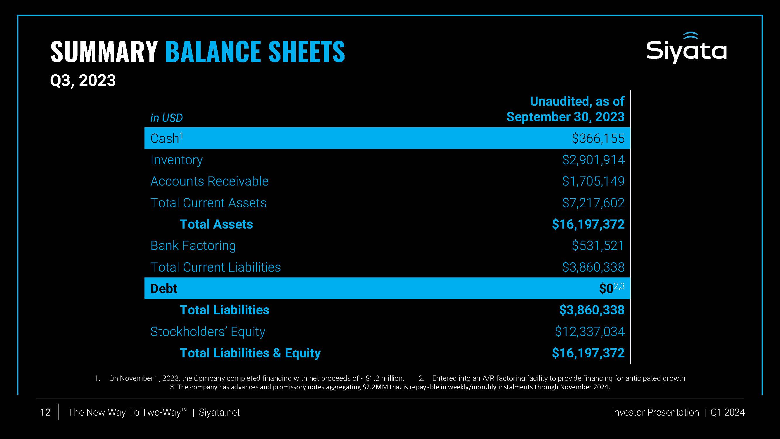 未经审计的资产负债表摘要,截至2023年9月30日,单位:美元366,155现金1美元2,901,914美元存货1,705,149美元应收账款7,217,602美元流动资产总额16,197,372美元总资产531,521美元银行保理3,860,338美元流动负债总额0 2,3债务3,860,338美元总负债12,337,034美元股东权益16,197,372美元总负债和权益12通往两条道路的新途径-TM | Siyata.net投资者介绍| 2024年第一季度1。2023年11月1日,公司完成融资,净收益约120万美元。2.进入A/R保理设施,为预期增长提供融资3。该公司拥有总额为2.2mm的预付款和期票,可在2024年11月之前按周/月分期偿还。2023年第三季度